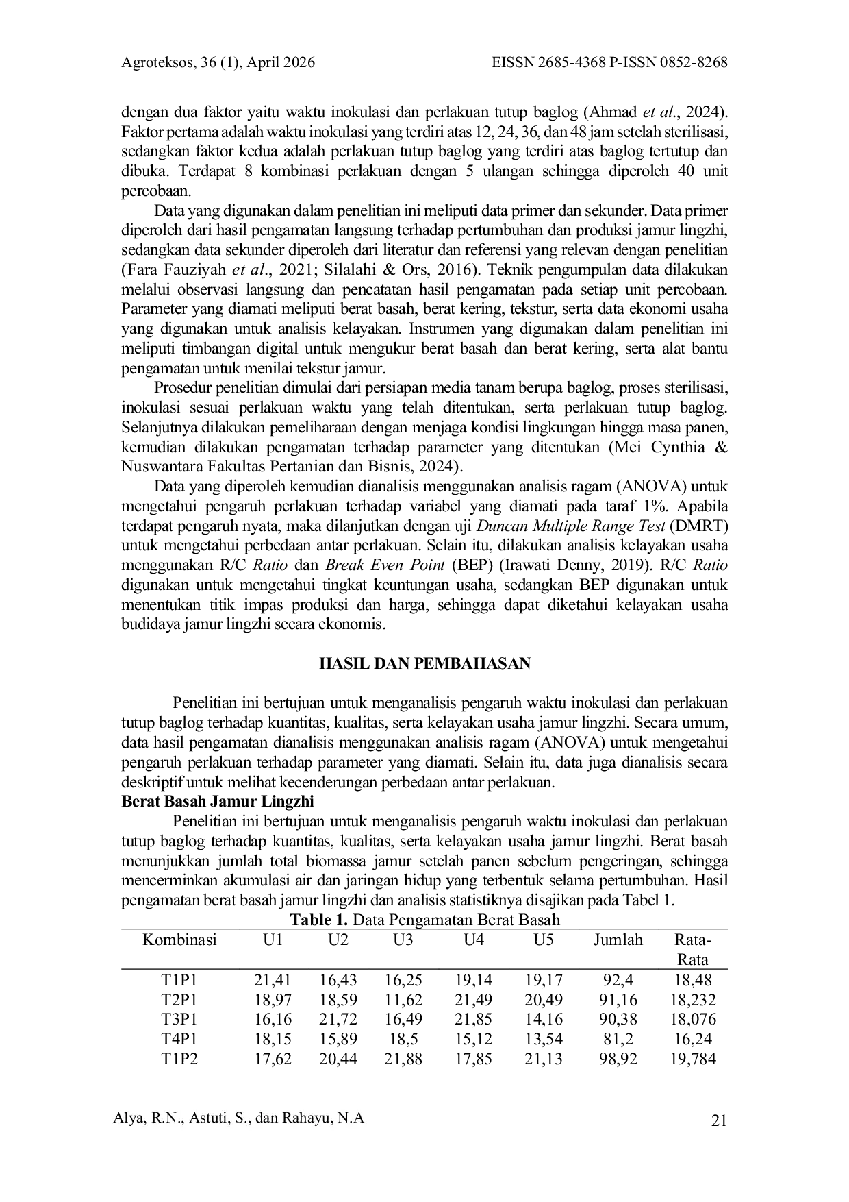 Penelitian ini menunjukkan bahwa waktu inokulasi dan perlakuan tutup baglog tidak memberikan pengaruh nyata terhadap berat basah, berat kering, dan tekstur jamur lingzhi.Hal ini menunjukkan bahwa perlakuan yang diberikan belum mampu meningkatkan kuantitas dan kualitas produksi secara signifikan, sehingga faktor lingkungan diduga lebih berperan dalam menentukan pertumbuhan jamur lingzhi.Meskipun tidak berpengaruh nyata, secara deskriptif terdapat kecenderungan perlakuan tertentu menghasilkan produksi yang lebih tinggi.Selain itu, hasil analisis kelayakan usaha menunjukkan bahwa budidaya jamur lingzhi tetap layak untuk dikembangkan karena memberikan keuntungan secara ekonomi.