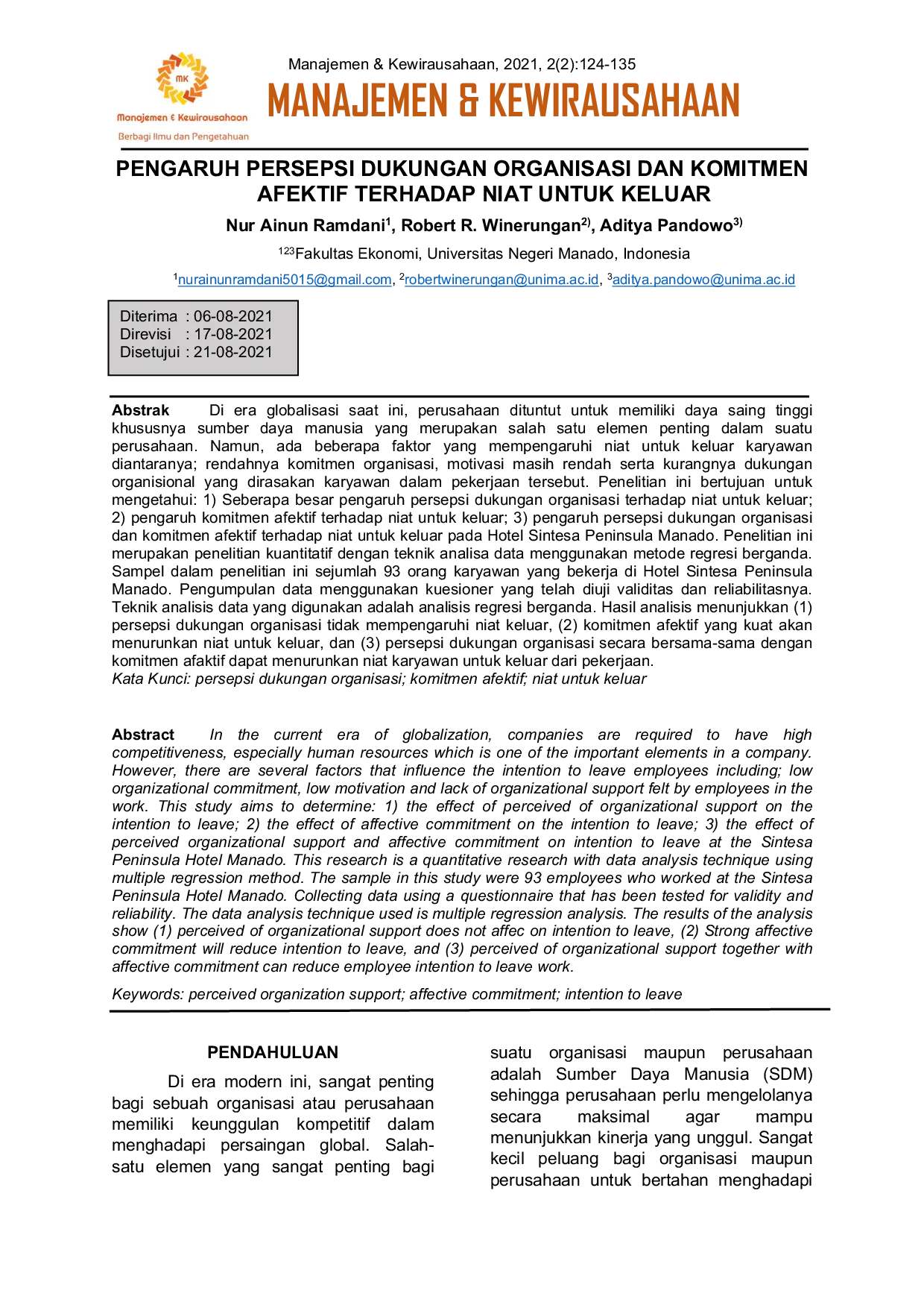 Manajemen dan KewirausahaanManajemen dan KewirausahaanDi era globalisasi saat ini, perusahaan dituntut untuk memiliki daya saing tinggi khususnya sumber daya manusia yang merupakan salah satu elemen penting dalam suatu perusahaan. Namun, ada beberapa faktor yang mempengaruhi niat untuk keluar karyawan diantaranya; rendahnya komitmen organisasi, motivasi masih rendah serta kurangnya dukungan organisional yang dirasakan karyawan dalam pekerjaan tersebut. Penelitian ini bertujuan untuk mengetahui: 1) Seberapa besar pengaruh persepsi dukungan organisasi terhadap niat untuk keluar; 2) pengaruh komitmen afektif terhadap niat untuk keluar; 3) pada Hotel Sintesa Peninsula Manado. Penelitian ini merupakan penelitian kuantitatif dengan teknik analisa data menggunakan metode regresi berganda. Sampel dalam penelitian ini sejumlah 93 orang karyawan yang bekerja di Hotel Sintesa Peninsula Manado. Pengumpulan data menggunakan kuesioner yang telah diuji validitas dan reliabilitasnya. Teknik analisis data yang digunakan adalah analisis regresi berganda. Hasil analisis menunjukkan (1) persepsi dukungan organisasi tidak mempengaruhi niat keluar, (2) komitmen afektif yang kuat akan menurunkan niat untuk keluar, dan (3) persepsi dukungan organisasi secara bersama-sama dengan komitmen afaktif dapat menurunkan niat karyawan untuk keluar dari pekerjaan.