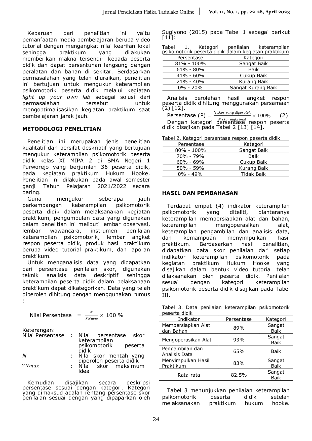 JPFT (Jurnal Pendidikan Fisika Tadulako Online)JPFT (Jurnal Pendidikan Fisika Tadulako Online)Pemberian pengalaman yang nyata terhadap siswa sangat dibutuhkan bagi peserta didik dalam pemahaman konsep fisika. Berdasarkan observasi terhadap peserta didik kelas XI MIPA 2 SMAN1 Purworejo di kelas, sebanyak 52% peserta didik merasa kekurangan dalam pengalaman praktikum fisika terutama pada pokok bahasan Hukum Hooke. Penelitian ini bertujuan untuk mengukur keterampilan psikomotorik peserta didik melalui optimalisasi kegiatan praktikum pada pembelajaran jarak jauh dan menemukan solusi beberapa permasalahan. Jenis penelitian yang digunakan yaitu penelitian kualitatif deskriptif dengan menggunakan instrumen berupa instrumen penilaian keterampilan psikomotorik dan lembar angket respon peserta didik. Penilaian kemampuan psikomotorik peserta didik dalam melaksanakan kegiatan praktikum mandiri dalam kategori sangat baik dengan persentase sebesar 82,5%. Penilaian angket respon peserta didik terhadap media pembelajaran berupa video tutorial mendapat respon yang sangat baik dengan persentase sebesar 87,93%. Keterlaksanaan kegiatan optimalisasi praktikum dengan menggunakan media berupa video tutorial berbasis kearifan lokal dapat menjadi solusi yang efektif untuk membantu peserta didik dalam mengasah keterampilan psikomotoriknya.