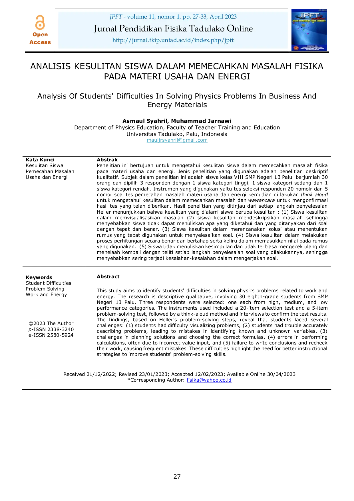 JPFT (Jurnal Pendidikan Fisika Tadulako Online)JPFT (Jurnal Pendidikan Fisika Tadulako Online)Penelitian ini bertujuan untuk mengetahui kesulitan siswa dalam memecahkan masalah fisika pada materi usaha dan energi. Jenis penelitian yang digunakan adalah penelitian deskriptif kualitatif. Subjek dalam penelitian ini adalah siswa kelas VIII SMP Negeri 13 Palu berjumlah 30 orang dan dipilih 3 responden dengan 1 siswa kategori tinggi, 1 siswa kategori sedang dan 1 siswa kategori rendah. Instrumen yang digunakan yaitu tes seleksi responden 20 nomor dan 5 nomor soal tes pemecahan masalah materi usaha dan energi kemudian di lakukan think aloud untuk mengetahui kesulitan dalam memecahkan masalah dan wawancara untuk mengonfirmasi hasil tes yang telah diberikan. Hasil penelitian yang ditinjau dari setiap langkah penyelesaian Heller menunjukkan bahwa kesulitan yang dialami siswa berupa kesulitan : (1) Siswa kesulitan dalam memvisualisasikan masalah (2) siswa kesulitan mendeskripsikan masalah sehingga menyebabkan siswa tidak dapat menuliskan apa yang diketahui dan yang ditanyakan dari soal dengan tepat dan benar. (3) Siswa kesulitan dalam merencanakan solusi atau menentukan rumus yang tepat digunakan untuk menyelesaikan soal. (4) Siswa kesulitan dalam melakukan proses perhitungan secara benar dan bertahap serta keliru dalam memasukkan nilai pada rumus yang digunakan. (5) Siswa tidak menuliskan kesimpulan dan tidak terbiasa mengecek ulang dan menelaah kembali dengan teliti setiap langkah penyelesaian soal yang dilakukannya, sehingga sering terjadi kesalahan-kesalahan dalam mengerjakan soal.