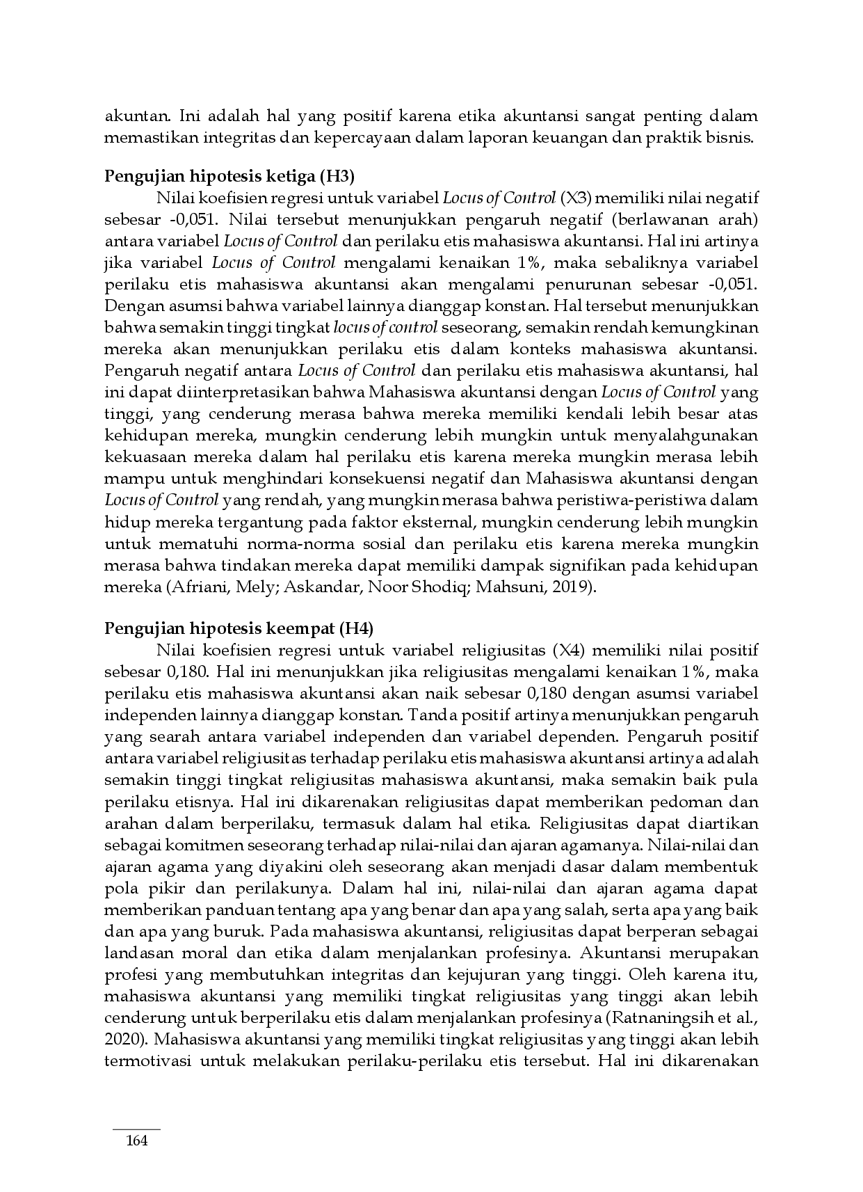 Pemahaman kode etik akuntan, kepekaan etis, dan religiusitas meningkatkan perilaku etis mahasiswa akuntansi.Sebaliknya, locus of control yang tinggi cenderung menurunkan perilaku etis.