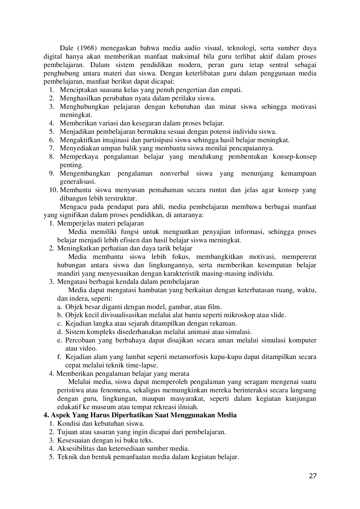 Jurnal Pendidikan MultidisiplinerJurnal Pendidikan MultidisiplinerDengan kemajuan teknologi yang terus berkembang, media pembelajaran kini memegang peranan penting dalam mendukung proses pendidikan. Hal ini mendorong para pendidik untuk memanfaatkan berbagai media pembelajaran yang terus berkembang sebagai sarana bantu dalam penyampaian materi, sehingga pembelajaran dapat berlangsung lebih optimal. Perubahan teknologi memberikan pengaruh besar dalam ranah pendidikan, khususnya pada aspek proses pembelajaran. Saat ini, media audio visual, teknologi, dan sumber daya digital menjadi alat yang sangat bermanfaat untuk meningkatkan mutu pembelajaran di berbagai tingkat pendidikan. Tujuan dari penulisan artikel ini adalah untuk menguraikan betapa pentingnya penggunaan media tersebut dalam meningkatkan proses dan hasil belajar pada semua tingkat pendidikan. Jika dibandingkan, hasil belajar melalui indera penglihatan dan pendengaran menunjukkan perbedaan yang signifikan. Sekitar 75% informasi diperoleh melalui penglihatan, sementara hanya 13% melalui pendengaran, dan sisanya 12% melalui indera lainnya. Temuan ini menegaskan bahwa penggunaan media audio visual, teknologi, dan sumber daya digital memberikan kontribusi besar terhadap tercapainya pembelajaran yang efektif. Di samping mempermudah siswa dalam memahami materi ajar, hal ini juga mendorong guru untuk lebih kreatif dalam merancang penyampaian materi, menyesuaikan strategi pembelajaran dengan karakteristik peserta didik, dan menentukan media yang sesuai serta optimal.