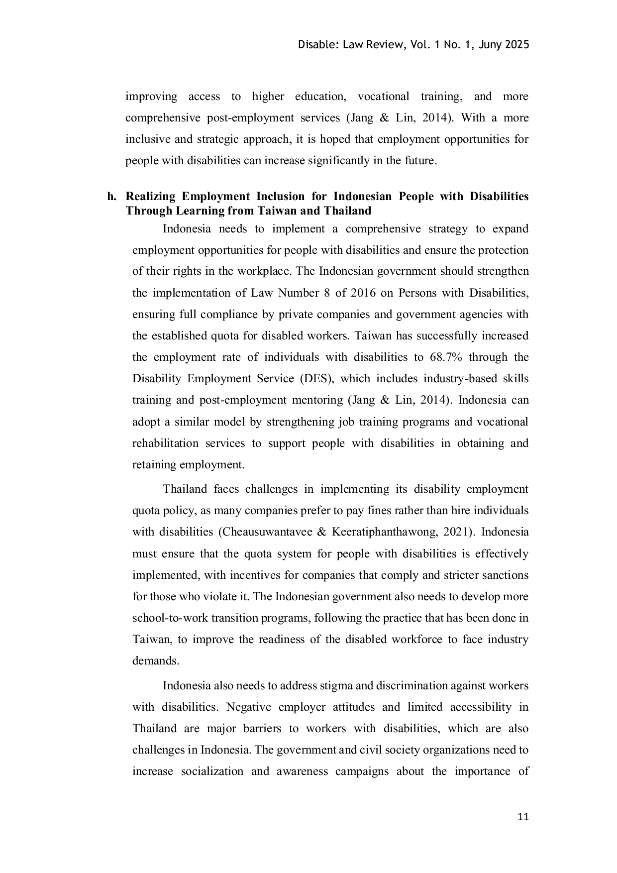 DisableDisablePersons with disabilities in Indonesia continue to face numerous obstacles in accessing decent employment, despite the enactment of legal protections such as Law Number 8 of 2016, which is intended to safeguard their rights. Although this regulation is intended to serve as a strong foundation for promoting equality in the labor market, its implementation has not yet met expectations. Findings from this study indicate that the policys implementation remains suboptimal due to weak institutional oversight, limited employer awareness of the capabilities of persons with disabilities, inadequate workplace accessibility, insufficient dissemination of disability rights, lack of incentives for inclusive employers, and the scarcity of necessary support facilities. These issues were identified through legislative, conceptual, and comparative approaches involving both primary legal materials and relevant secondary sources. To foster equal employment opportunities, strategic measures are needed, such as strengthening labor supervision systems, offering fiscal incentives to inclusive companies, improving the physical accessibility of work environments, and providing comprehensive job training programs tailored for persons with disabilities.