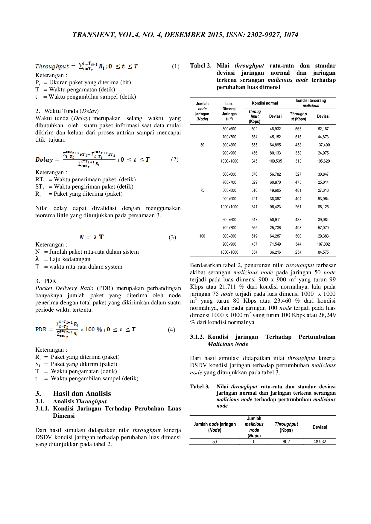 Transient: Jurnal Ilmiah Teknik ElektroTransient: Jurnal Ilmiah Teknik ElektroMANET merupakan teknologi telekomunikasi yang dikembangkan untuk memberikan kemudahan bagi pengguna dalam berkomunikasi. MANET terbentuk dari beberapa node yang bergerak bebas dan tidak bergantung pada infrastruktur tetap. Kelemahan utama MANET adalah masalah keamanannya. Node-node secara bebas masuk dan keluar dalam jaringan hal ini lah yang menyebabkan MANET rentan terhadap serangan. Salah satu contoh serangan dalam MANET adalah serangan malicious node. Pada penelitian menganalisis evaluasi kinerja DSDV pada MANET terhadap serangan malicious node. Beberapa parameter yang digunakan untuk mengukur kinerjanya antara lain throughput, delay total dan PDR. Perancangan MANET dilakukan menggunakan software NS2. Hasil simulasi menunjukkan serangan malicious node mengakibatkan penurunan nilai throughput, delay, dan PDR disetiap kondisi. Penurunan nilai throughput terbesar terjadi pada kondisi jaringan yang mengalami perubahan luas dimensi, yaitu jaringan 100 node dimensi 1000x1000 m2 turun 100 Kbps dari kondisi normalnya. Sementara penurunan nilai delay total terbesar terjadi pada kondisi jaringan yang mengalamai perubahan kecepatan gerak node, yaitu pada jaringan 75 node saat kecepatan gerak node-nya 1,75 m/s turun 30,53 ms dari kondisi normalnya. Serangan malicious node memberikan efek paling besar untuk nilai PDR pada kondisi jaringan yang mengalami perubahan luas dimensi, yaitu jaringan 50 node dimensi 1000x1000 m2 turun 0,76% dari kondisi normalnya.