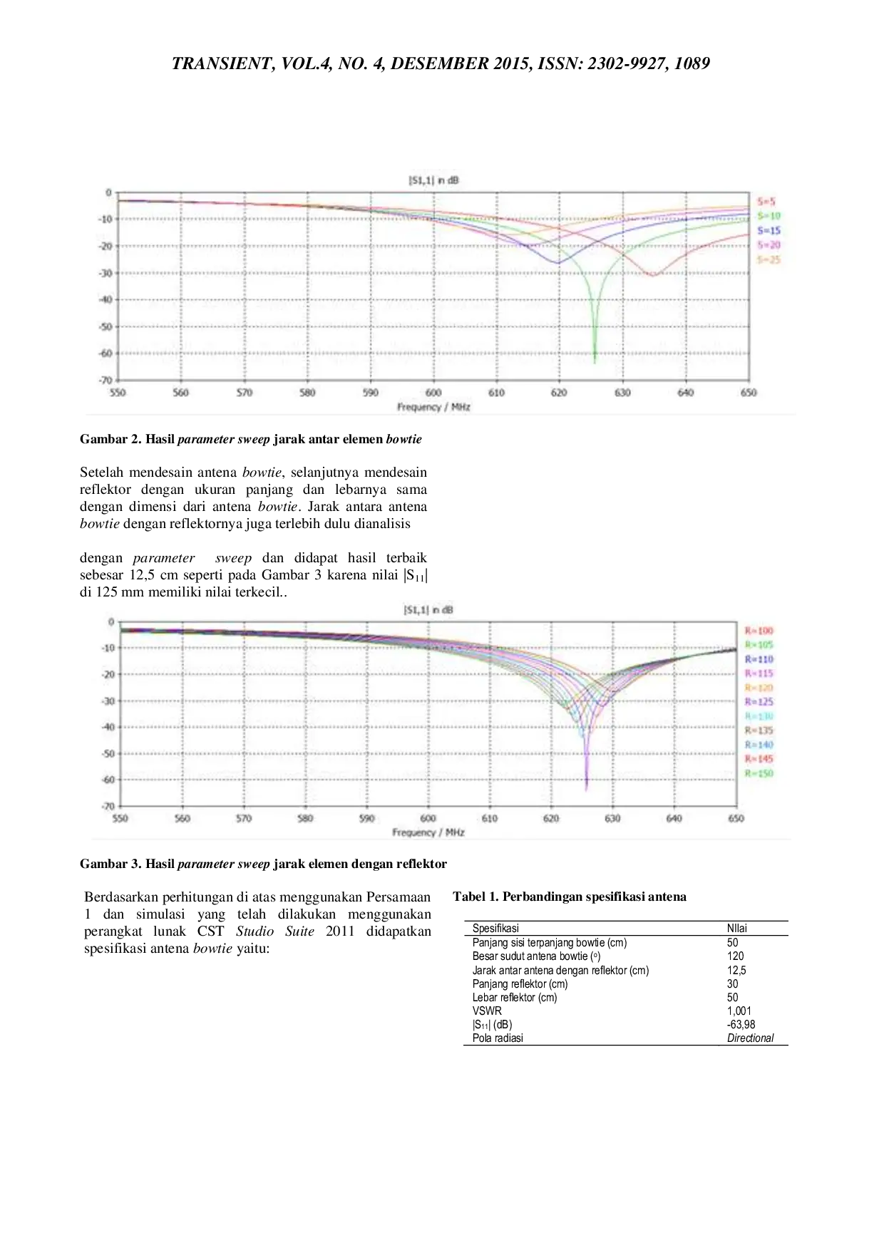 Antena bowtie adalah antena directional yang memiliki nilai gain yang tinggi antara 17-40%, pada perancangan kali ini didapatkan gain 24,8% sehingga sesuai dengan spesifikasi gain antena bowtie.Nilai |S11| yang sangat rendah sebesar -40,08 dB dengan spesifikasi minimal -10 dB, membuat antena bowtie memiliki kesesuaian impedansi yang baik.Antena bowtie hasil perancangan pada penelitian ini sudah terbukti lebih baik kinerjanya dibandingkan dengan antena pembanding setelah diuji sebagai penerima siaran televisi digital.Adanya perbedaan pada hasil simulasi dan pengukuran dalam perancangan antena ini dapat disebabkan karena kurang akuratnya dalam memodelkan dimensi-dimensi antena dan dalam menentukan jarak ukur dalam pengujian antena karena karakteristik dimensi antena bowtie sensitif.