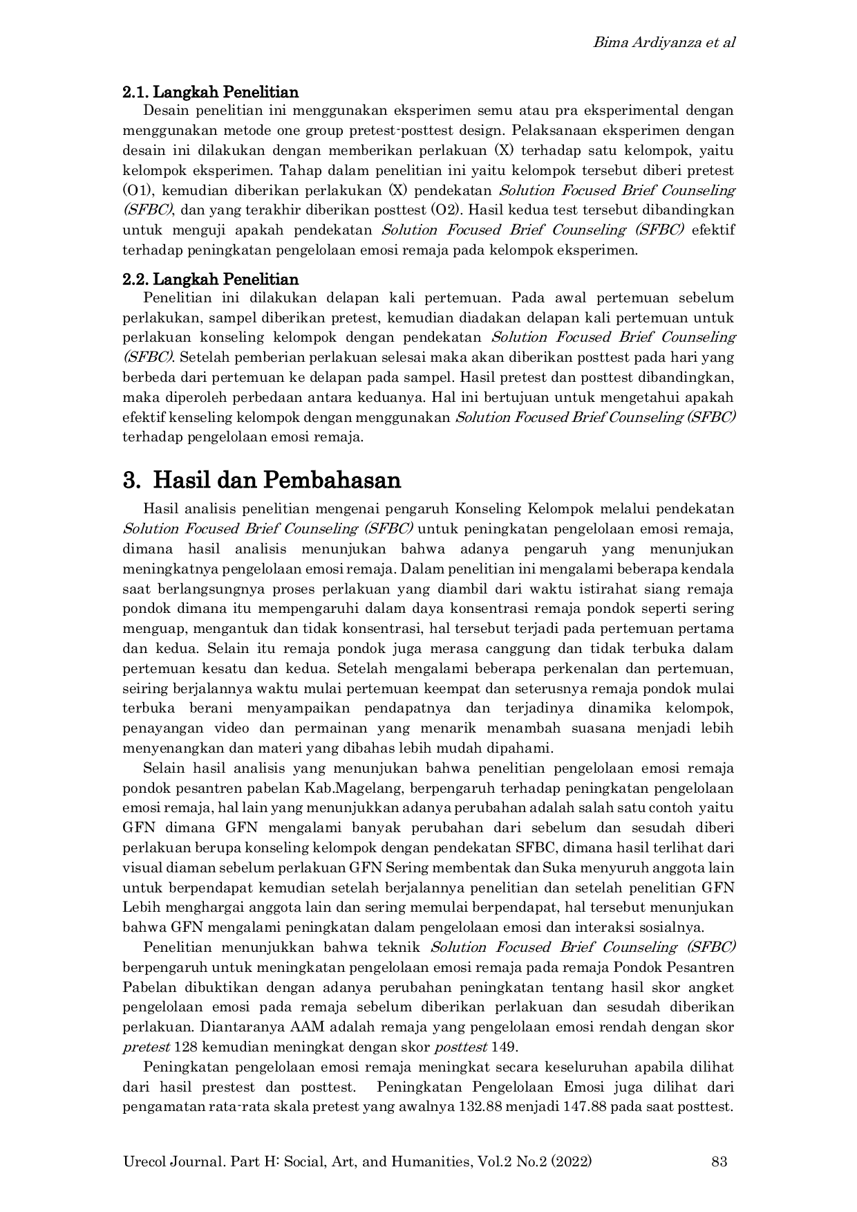 Urecol Journal. Part H: Social, Art, and HumanitiesUrecol Journal. Part H: Social, Art, and HumanitiesPenelitian ini bertujuan untuk menguji pengaruh konseling kelompok melalui pendekatan Solution Focused Brief Counseling (SFBC) untuk meningkatkan pengelolaan emosi remaja. Penelitian ini menggunakan desain One Group Pretest-Posttest Design. Sampel yang diambil dalam penelitian ini sebanyak 8 remaja yang terdiri dari satu kelompok eksperimen. Pengambilan sampel menggunakan teknik random sampling. Metode pengumpulan data dilakukan dengan menggunakan angket pengelolaan emosi. Metode analisis data yang digunakan yaitu analisis parametrik Paired sample t-test. Hasil penelitian ini menunjukkan bahwa konseling kelompok melalui pendekatan Solution Focused Brief Counseling (SFBC) berpengaruh untuk meningkatkan pengelolaan emosi remaja. Hal ini dibuktikan dari hasil uji paired sample t-test dengan probabilitas nilai sig (2-tailed) 0,000 < 0,05. Berdasarkan hasil analisis dan pembahasan, terdapat perbedaan skor rata-rata angket pengelolaan emosi 12,90% dari hasil pretest dan posttest. Hasil dari penelitian dapat disimpulkan bahwa konseling kelompok melalui pendekatan Solution Focused Brief Counseling (SFBC) berpengaruh untuk meningkatkan pengelolaan emosi remaja.