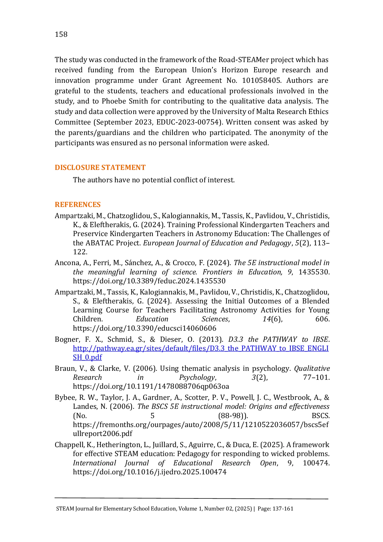 STEAM Journal For Elementary School EducationSTEAM Journal For Elementary School EducationPenelitian ini mengevaluasi sebuah workshop astronomi berbasis STEAM (Science, Technology, Engineering, Arts, Mathematics) bagi anak-anak yang dilaksanakan di dua acara keterlibatan ilmu pengetahuan di Malta: Science in the City 2023 dan Unconventional Science Careers Days 2023. Metodologi campuran digunakan dengan mengumpulkan data kuesioner dari 122 peserta (usia rata‑rata 10 tahun) serta pengamatan praktisi. Hasil kuantitatif menunjukkan bahwa mayoritas peserta (80,3 %) menganggap workshop mudah dipahami, meskipun 91,8 % melaporkan tidak mempelajari konten baru; namun 51,6 % menyatakan minat kuat untuk mempelajari lebih lanjut tentang astronomi. Analisis kualitatif menyoroti bahwa peserta menghargai pengetahuan astronomi, kesenangan, dan proses kreatif, seringkali mengaitkan pembelajaran dengan konteks personal seperti tanda zodiak. Pengamatan praktik menegaskan peran keterlibatan orang tua yang dapat mendukung atau mengganggu. Temuan ini menunjukkan bahwa workshop STEAM yang menekankan proses seni dapat merangsang rasa ingin tahu, keterlibatan, dan relevansi budaya dalam pendidikan astronomi, sekaligus menyoroti pentingnya pelatihan fasilitator dan scaffolding yang cermat untuk menyeimbangkan kreativitas dengan akurasi konseptual.