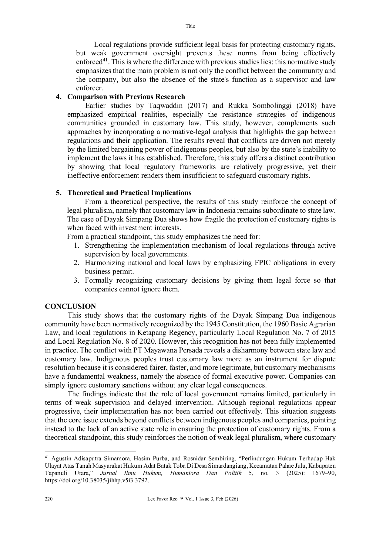 Penelitian ini menunjukkan bahwa hak ulayat masyarakat adat Dayak Simpang Dua telah diakui secara normatif melalui UUD 1945, UUPA 1960, dan peraturan daerah di Kabupaten Ketapang, namun pengakuan tersebut belum terlaksana secara efektif di lapangan.Ketidakselarasan antara hukum negara dan hukum adat terlihat jelas dalam sengketa dengan PT Mayawana Persada, di mana masyarakat lebih mempercayai hukum adat karena dianggap lebih adil, cepat, dan sah secara sosial, meskipun tidak memiliki kekuatan eksekutorial formal.Peran pemerintah daerah dinilai terbatas akibat pengawasan yang lemah dan intervensi yang terlambat, sehingga menunjukkan bahwa masalah utama bukan hanya konflik masyarakat dengan perusahaan, tetapi juga absennya negara dalam menjamin perlindungan hak ulayat secara aktif.