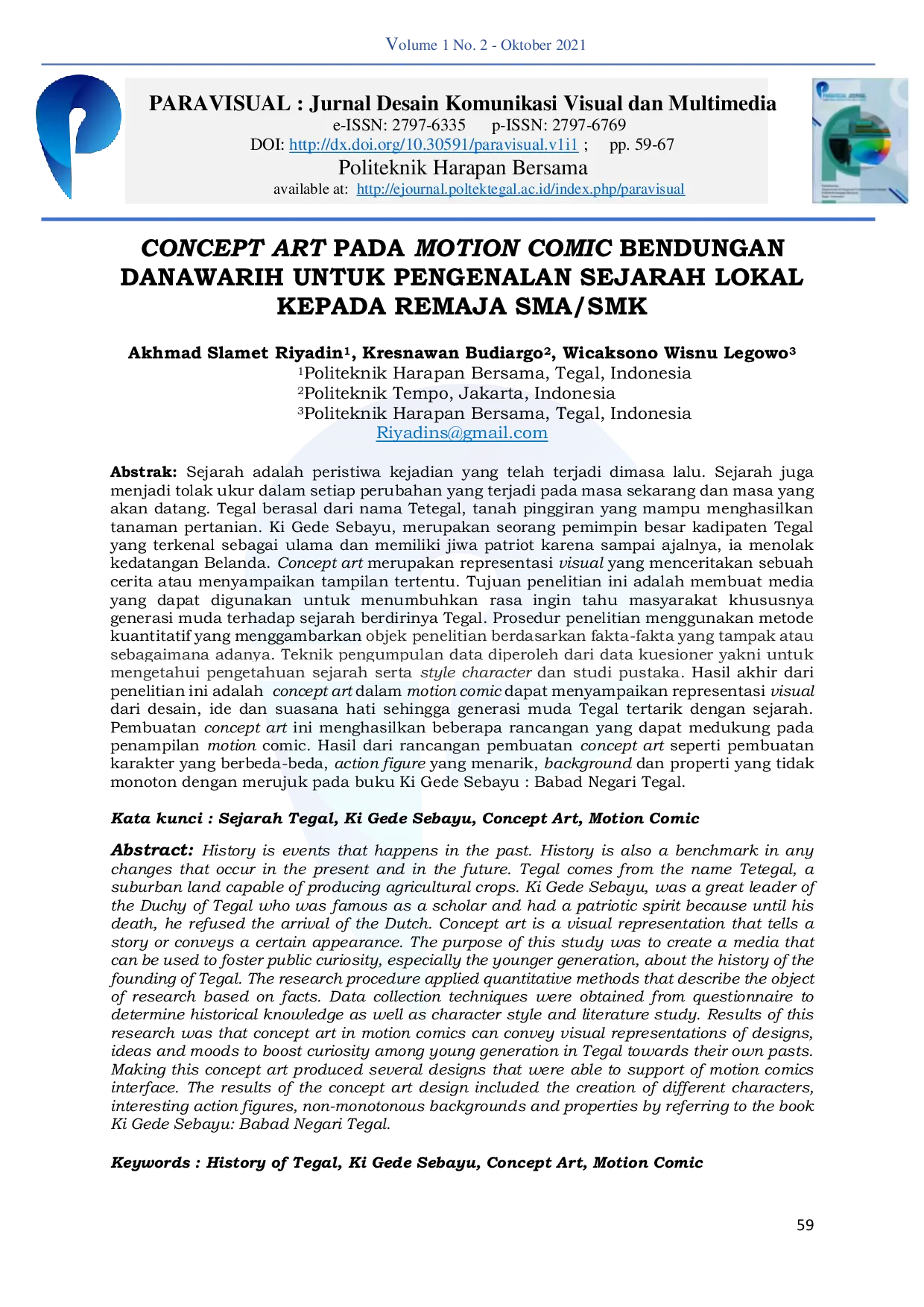 PARAVISUAL : Jurnal Desain Komunikasi Visual dan MultimediaPARAVISUAL : Jurnal Desain Komunikasi Visual dan MultimediaSejarah adalah peristiwa kejadian yang telah terjadi di masa lalu. Sejarah juga menjadi tolok ukur dalam setiap perubahan yang terjadi pada masa sekarang dan masa yang akan datang. Tegal berasal dari nama Tetegal, tanah pinggiran yang mampu menghasilkan tanaman pertanian. Ki Gede Sebayu, merupakan seorang pemimpin besar kadipaten Tegal yang terkenal sebagai ulama dan memiliki jiwa patriot karena sampai ajalnya, ia menolak kedatangan Belanda. Concept art merupakan representasi visual yang menceritakan sebuah cerita atau menyampaikan tampilan tertentu. Tujuan penelitian ini adalah membuat media yang dapat digunakan untuk menumbuhkan rasa ingin tahu masyarakat khususnya generasi muda terhadap sejarah berdirinya Tegal. Prosedur penelitian menggunakan metode kuantitatif yang menggambarkan objek penelitian berdasarkan fakta-fakta yang tampak atau sebagaimana adanya. Teknik pengumpulan data diperoleh dari data kuesioner yakni untuk mengetahui pengetahuan sejarah serta style character dan studi pustaka. Hasil akhir dari penelitian ini adalah concept art dalam motion comic dapat menyampaikan representasi visual dari desain, ide dan suasana hati sehingga generasi muda Tegal tertarik dengan sejarah. Pembuatan concept art ini menghasilkan beberapa rancangan yang dapat mendukung pada penampilan motion comic. Hasil dari rancangan pembuatan concept art seperti pembuatan karakter yang berbeda-beda, action figure yang menarik, background dan properti yang tidak monoton dengan merujuk pada buku Ki Gede Sebayu: Babad Negari Tegal.