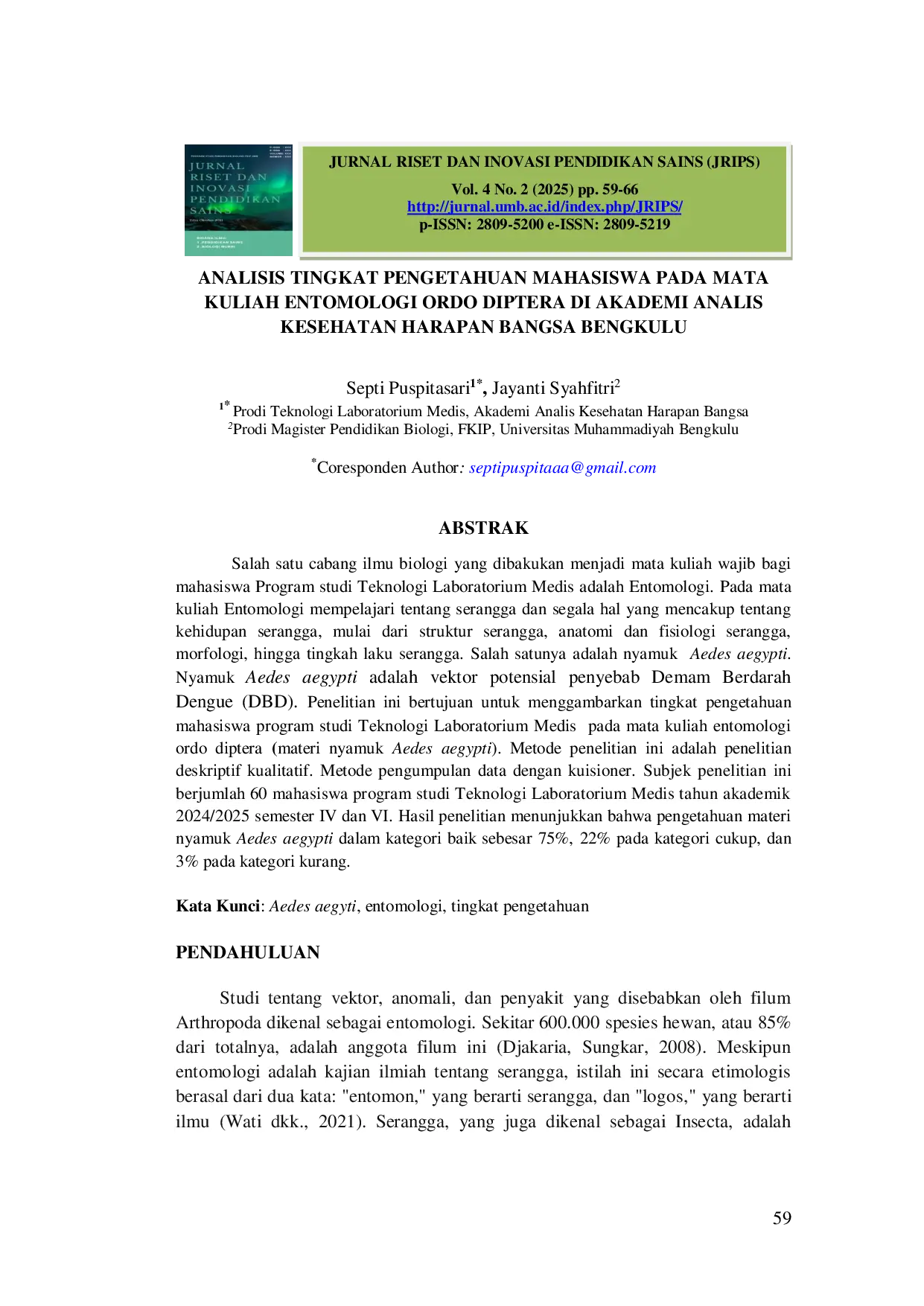 Jurnal Riset dan Inovasi Pendidikan Sains (JRIPS)Jurnal Riset dan Inovasi Pendidikan Sains (JRIPS)Salah satu cabang ilmu biologi yang dibakukan menjadi mata kuliah wajib bagi mahasiswa Program studi Teknologi Laboratorium Medis adalah Entomologi. Pada mata kuliah Entomologi mempelajari tentang serangga dan segala hal yang mencakup tentang kehidupan serangga, mulai dari struktur serangga, anatomi dan fisiologi serangga, morfologi, hingga tingkah laku serangga. Salah satunya adalah nyamuk Aedes aegypti. Nyamuk Aedes aegypti adalah vektor potensial penyebab Demam Berdarah Dengue (DBD). Penelitian ini bertujuan untuk menggambarkan tingkat pengetahuan mahasiswa program studi Teknologi Laboratorium Medis pada mata kuliah entomologi ordo diptera (materi nyamuk Aedes aegypti). Metode penelitian ini adalah penelitian deskriptif kualitatif. Metode pengumpulan data dengan kuisioner. Subjek penelitian ini berjumlah 60 mahasiswa program studi Teknologi Laboratorium Medis tahun akademik 2024/2025 semester IV dan VI. Hasil penelitian menunjukkan bahwa pengetahuan materi nyamuk Aedes aegypti dalam kategori baik sebesar 75%, 22% pada kategori cukup, dan 3% pada kategori kurang.