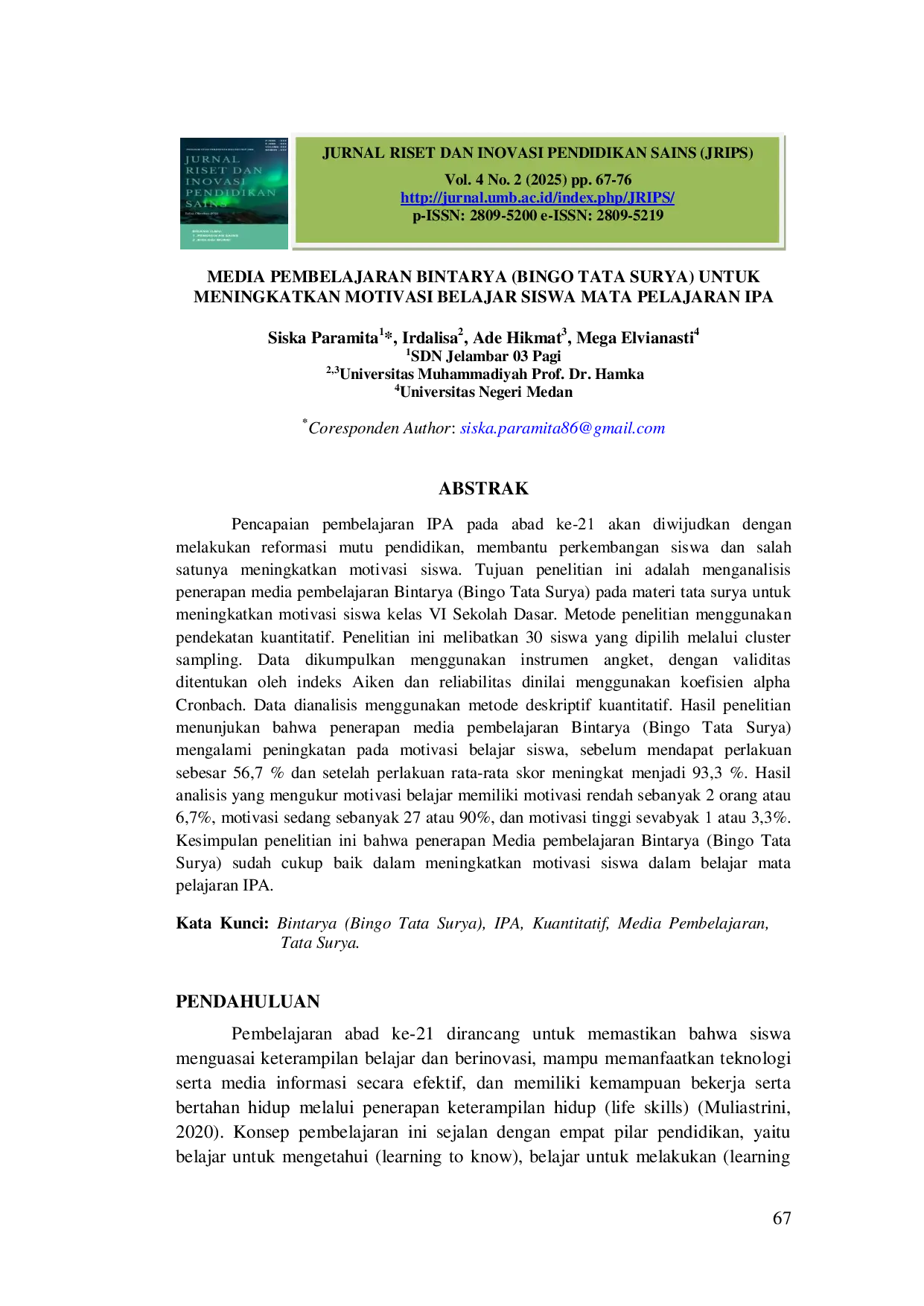 Berdasarkan hasil penelitian ini, beberapa saran penelitian lanjutan dapat diajukan. Pertama, penelitian lebih lanjut dapat dilakukan untuk menguji efektivitas media Bintarya (Bingo Tata Surya) pada materi IPA lainnya, seperti sistem pencernaan atau energi. Hal ini akan memperluas pemahaman tentang potensi media ini dalam meningkatkan motivasi dan hasil belajar siswa di berbagai topik IPA. Kedua, penelitian dapat difokuskan pada pengembangan variasi permainan Bingo Tata Surya dengan tingkat kesulitan yang berbeda, disesuaikan dengan kemampuan siswa yang beragam. Dengan demikian, media ini dapat lebih inklusif dan memberikan tantangan yang sesuai bagi setiap siswa. Ketiga, penelitian dapat menggali lebih dalam mengenai faktor-faktor lain yang mempengaruhi motivasi belajar siswa dalam pembelajaran IPA, seperti gaya belajar, lingkungan belajar, dan interaksi sosial. Pemahaman yang komprehensif tentang faktor-faktor ini akan membantu guru dalam merancang strategi pembelajaran yang lebih efektif dan personal.