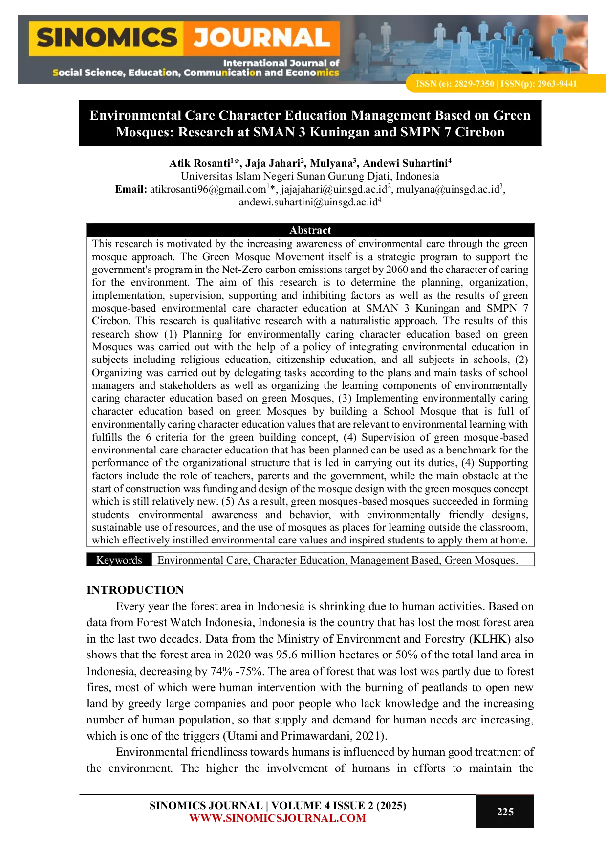 International Journal of Social Science, Education, Communication and EconomicsInternational Journal of Social Science, Education, Communication and EconomicsPenelitian ini didorong oleh peningkatan kesadaran akan pengelolaan lingkungan melalui pendekatan Masjid Hijau, yang merupakan program strategis mendukung target Net‑Zero emisi karbon pemerintah hingga 2060 sekaligus menanam karakter kepedulian lingkungan. Tujuan utamanya ialah menentukan perencanaan, organisasi, pelaksanaan, pengawasan, dukungan, hambatan, dan hasil pendidikan karakter perawatan lingkungan berbasis Masjid Hijau di SMAN 3 Kuningan dan SMPN 7 Cirebon. Metode penelitian kualitatif dengan pendekatan naturalistik menghasilkan temuan bahwa perencanaan didukung kebijakan integrasi pendidikan lingkungan ke dalam mata pelajaran, organisasi dilaksanakan melalui delegasi tugas pengurus sekolah dan stakeholder, pelaksanaan membangun Masjid Sekolah yang mematuhi kriteria bangunan hijau, serta pengawasan melakukan benchmarking kinerja struktur organisasi. Faktor pendukung meliputi peran guru, orang tua, dan pemerintah; sedangkan hambatan utama adalah dana dan desain awal Masjid Hijau. Hasilnya menunjukkan bahwa Masjid Hijau berhasil membentuk kesadaran dan perilaku pelajar terhadap lingkungan melalui desain ramah lingkungan, penggunaan energi terbarukan, dan pemanfaatan masjid sebagai tempat belajar di luar kelas, yang kemudian menginspirasi penerapan nilai lingkungan di rumah.