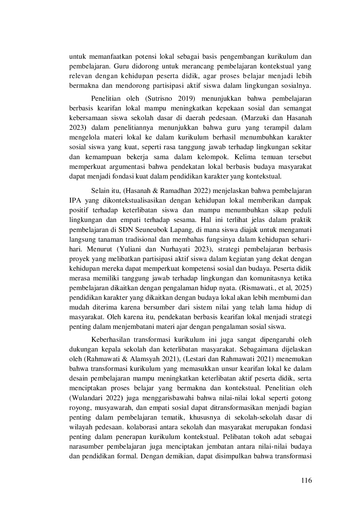 Berdasarkan hasil penelitian yang telah dilakukan di Sekolah Dasar Negeri Seuneubok Lapang, Kecamatan Darul Ihsan, Kabupaten Aceh Timur, dapat disimpulkan bahwa transformasi kurikulum melalui integrasi kearifan lokal dalam pembelajaran Ilmu Pengetahuan Alam (IPA) memberikan dampak positif terhadap pembentukan karakter sosial peserta didik di daerah pedesaan.Integrasi ini dilakukan dengan cara mengaitkan materi pembelajaran IPA dengan praktik-praktik budaya lokal yang masih hidup dalam kehidupan masyarakat.Integrasi kearifan lokal dalam kurikulum bukan hanya sebagai bentuk pelestarian budaya, melainkan juga sebagai strategi inovatif dalam meningkatkan mutu pendidikan karakter.
