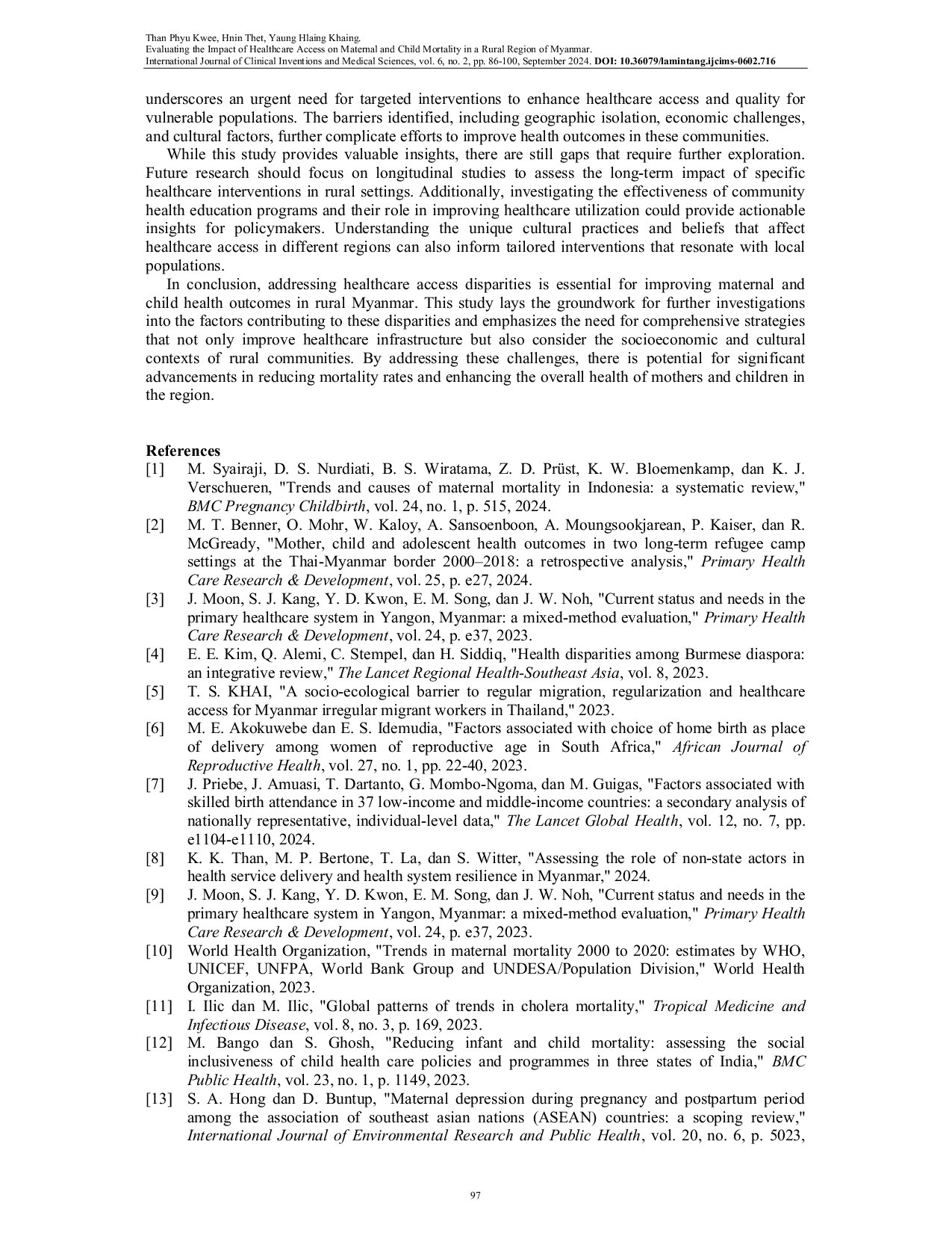 International Journal of Clinical Inventions and Medical Sciences (IJCIMS)International Journal of Clinical Inventions and Medical Sciences (IJCIMS)Studi ini mengevaluasi dampak akses kesehatan terhadap tingkat mortalitas ibu dan anak di daerah pedesaan Kayin State, Myanmar, di mana disparitas layanan kesehatan secara signifikan mempengaruhi populasi rentan. Menggunakan desain studi lintas-seksi dari Februari hingga Juli 2024, penelitian ini menerapkan metodologi kuantitatif dan kualitatif. Data kuantitatif dikumpulkan dari catatan kesehatan pemerintah dan fasilitas kesehatan lokal, termasuk tingkat mortalitas ibu dan anak, ketersediaan fasilitas kesehatan, dan distribusi tenaga kesehatan. Wawasan kualitatif diperoleh melalui wawancara semi-terstruktur dengan penyedia layanan kesehatan, ibu, dan pemangku kepentingan lokal, dengan fokus pada hambatan akses kesehatan. Temuan mengungkapkan tingkat mortalitas ibu yang mengkhawatirkan sebesar 250 per 100.000 kelahiran hidup dan tingkat mortalitas anak sebesar 80 per 1.000 kelahiran hidup di daerah pedesaan, dibandingkan dengan rekan-rekan perkotaan mereka. Hambatan utama yang diidentifikasi termasuk isolasi geografis, tantangan ekonomi, dan faktor budaya yang membatasi pemanfaatan layanan kesehatan. Studi ini menekankan kebutuhan mendesak untuk intervensi yang ditargetkan untuk meningkatkan akses kesehatan di komunitas pedesaan. Penelitian masa depan harus menyelidiki dampak intervensi kesehatan dan efektivitas program pendidikan kesehatan untuk lebih memahami dan mengurangi disparitas kesehatan di pedesaan Myanmar.