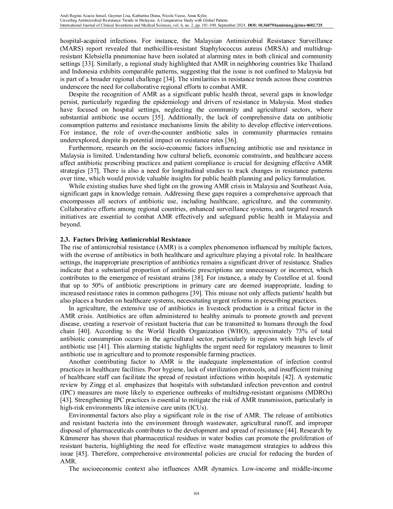 International Journal of Clinical Inventions and Medical Sciences (IJCIMS)International Journal of Clinical Inventions and Medical Sciences (IJCIMS)Penelitian ini mengeksplorasi pola resistensi antimikroba (AMR) di Malaysia, dengan fokus pada strain bakteri utama seperti MRSA, E. coli, Klebsiella, dan Pseudomonas. Data dikumpulkan dari laboratorium mikrobiologi klinis di rumah sakit publik dan swasta menggunakan desain studi observasional cross‑sectional. Analisis menunjukkan bahwa MRSA memiliki tingkat resistensi 45%, yang melebihi standar global 30% (p < 0.01). Sementara E. coli, Klebsiella, dan Pseudomonas mencatat tingkat resistensi masing‑masing 55%, 40%, dan 35%. Hasil ini menyoroti masalah meningkatnya AMR di Malaysia, khususnya di fasilitas kesehatan perkotaan. Penelitian menuntut peningkatan sistem pemantauan AMR dan promosi penggunaan antibiotik yang bertanggung jawab di seluruh negeri. Perbandingan dengan basis data dunia seperti WHO GLASS dan CDDEP memperlihatkan perlunya upaya terfokus di wilayah perkotaan untuk menangani tingkat resistensi yang terus meningkat. Penelitian ini menegaskan pentingnya kolaborasi antara pengambil kebijakan, penyedia layanan kesehatan, dan lembaga kesehatan masyarakat untuk segera memerangi AMR serta menyoroti perlunya penelitian tambahan guna menilai efisiensi metode yang ada dan menemukan cara inovatif dalam menanggulangi AMR di wilayah tersebut.