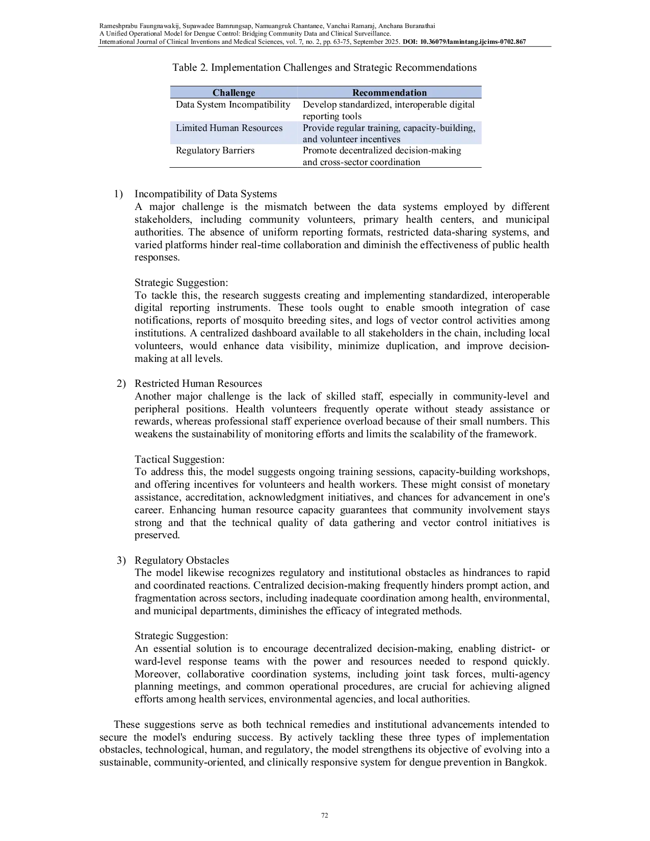 International Journal of Clinical Inventions and Medical Sciences (IJCIMS)International Journal of Clinical Inventions and Medical Sciences (IJCIMS)Demam dengue tetap menjadi masalah kesehatan urban yang signifikan di Bangkok, yang dipicu oleh kepadatan populasi, faktor lingkungan, dan sistem pengawasan yang tidak lengkap. Meskipun ada upaya kesehatan masyarakat yang berkelanjutan, masih ada kesenjangan antara inisiatif pengendalian vektor lokal dan pengawasan klinis institusional, yang menyebabkan respons wabah yang lebih lambat dan penggunaan sumber daya yang tidak efisien. Penelitian ini bertujuan untuk menciptakan model klinis dan lingkungan yang kohesif yang menggabungkan pemantauan nyamuk yang didorong komunitas, pelacakan dengue klinis, dan inisiatif kesehatan masyarakat menjadi satu sistem operasional. Dengan menggunakan pendekatan metode campuran, penelitian ini dilakukan dari Januari hingga November 2025 di distrik dengan insiden tinggi di Bangkok dan provinsi sekitarnya. Pengumpulan data terdiri dari diskusi kelompok fokus, wawancara dengan informan kunci, dan analisis sekunder terhadap statistik kasus dengue, pengukuran kepadatan vektor, dan operasi fogging. Pendekatan pengembangan model empat tahap digunakan, yang mencakup co-design dengan pemangku kepentingan, coding tematik informasi kualitatif, dan triangulasi set data kuantitatif. Hasil menunjukkan bahwa upaya respons saat ini terhambat oleh koneksi data yang terputus, fogging yang tidak tepat waktu, dan keterlibatan komunitas yang terbatas. Model yang diusulkan meningkatkan pertukaran data dan umpan balik waktu nyata di antara sukarelawan kesehatan komunitas, klinik, dan pejabat kota, memungkinkan pengelolaan vektor yang lebih baik dan respons wabah yang lebih cepat. Hal ini memungkinkan komunitas untuk berperan sebagai peserta proaktif dalam sistem pengawasan, bukan hanya sebagai penerima manfaat dari intervensi. Selain itu, model ini dirancang untuk fleksibel dan sesuai dengan berbagai pengaturan urban. Studi selanjutnya harus bertujuan untuk melakukan uji coba pilot model di distrik terpilih di Bangkok, dengan memasukkan alat pelaporan seluler, dan menilai efektivitas biaya dan skalabilitas di area urban Asia Tenggara yang lebih besar.
