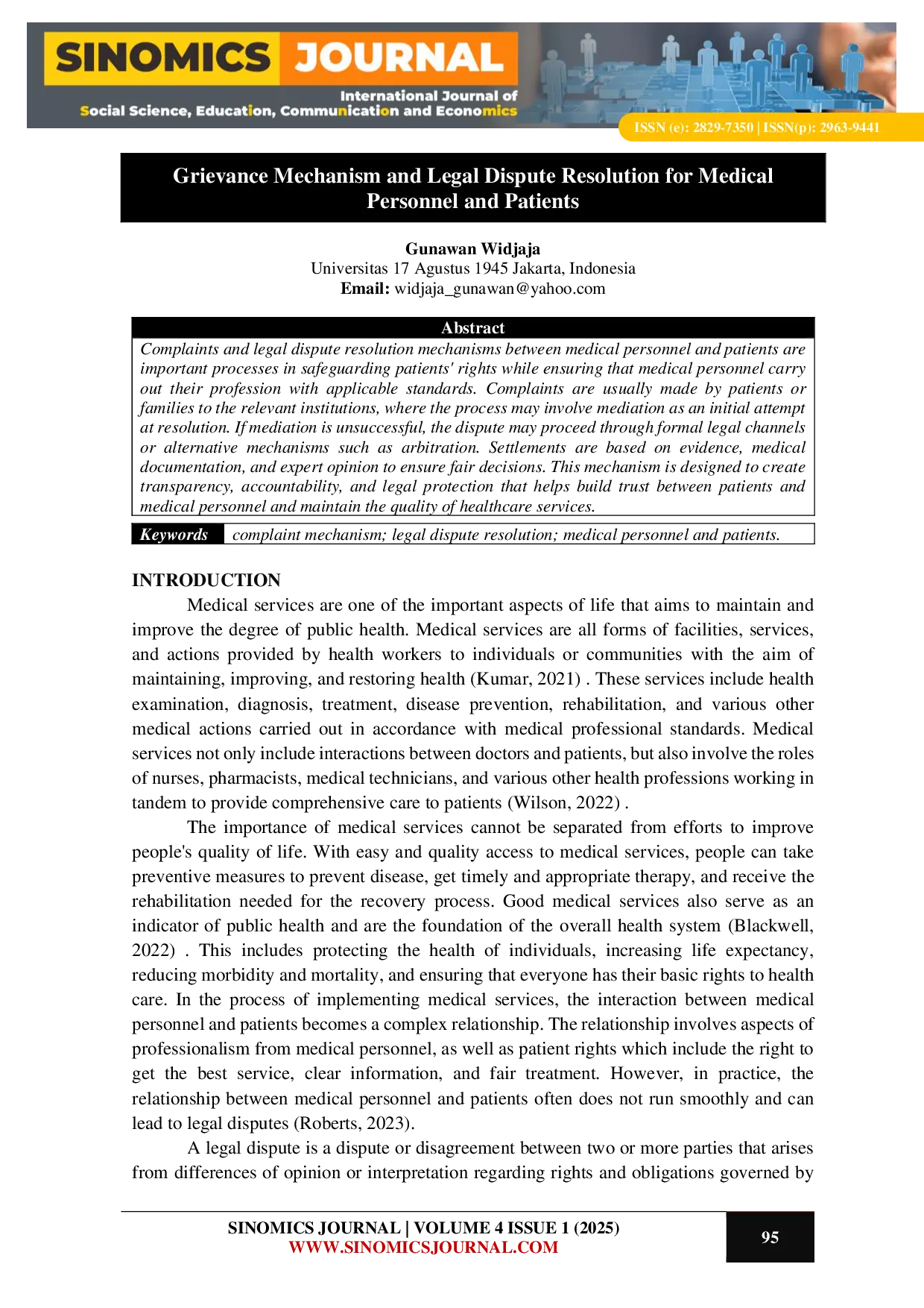 International Journal of Social Science, Education, Communication and EconomicsInternational Journal of Social Science, Education, Communication and EconomicsComplaints and legal dispute resolution mechanisms between medical personnel and patients are important processes in safeguarding patients rights while ensuring that medical personnel carry out their profession with applicable standards. Complaints are usually made by patients or families to the relevant institutions, where the process may involve mediation as an initial attempt at resolution. If mediation is unsuccessful, the dispute may proceed through formal legal channels or alternative mechanisms such as arbitration. Settlements are based on evidence, medical documentation, and expert opinion to ensure fair decisions. This mechanism is designed to create transparency, accountability, and legal protection that helps build trust between patients and medical personnel and maintain the quality of healthcare services.