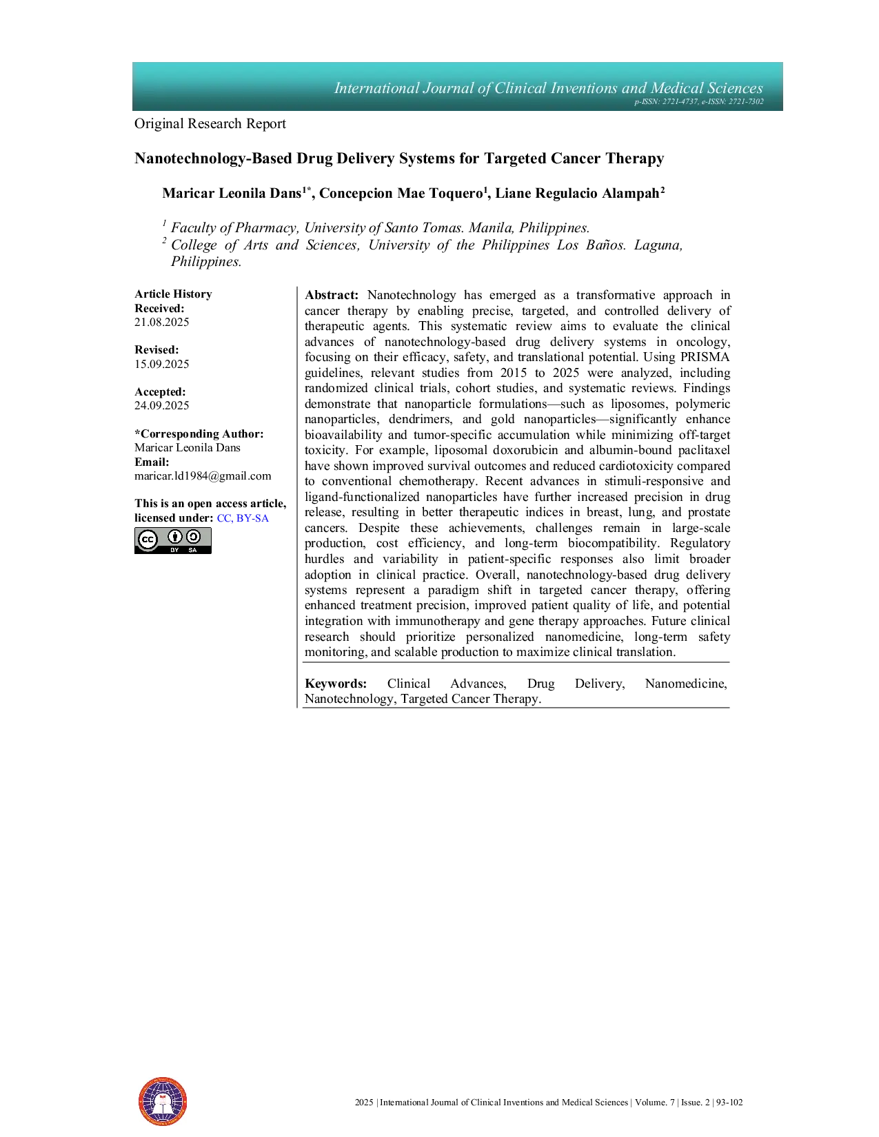 International Journal of Clinical Inventions and Medical Sciences (IJCIMS)International Journal of Clinical Inventions and Medical Sciences (IJCIMS)Nanoteknologi telah muncul sebagai pendekatan transformatif dalam terapi kanker dengan memungkinkan penyampaian agen terapeutik secara tepat, terarah, dan terkontrol. Tinjauan sistematis ini bertujuan mengevaluasi kemajuan klinis sistem pengiriman obat berbasis nanoteknologi di bidang onkologi, dengan fokus pada efektivitas, keamanan, dan potensi translasi. Menggunakan pedoman PRISMA, studi relevan dari 2015 hingga 2025 dianalisis, termasuk uji klinis teracak, studi kohort, dan tinjauan sistematis. Temuan menunjukkan bahwa formulasi nanopartikel—seperti liposom, nanopartikel polimerik, dendrimer, dan nanopartikel emas—meningkatkan bioavailabilitas dan akumulasi spesifik tumor sekaligus meminimalkan toksisitas off‑target. Sebagai contoh, liposom doxorubicin dan paclitaxel berbasis albumin telah memperlihatkan hasil kelangsungan hidup yang lebih baik dan menurunkan toksisitas kardiovaskular dibandingkan kemoterapi konvensional. Kemajuan terbaru dalam nanopartikel responsif rangsangan dan berfungsi ligand telah meningkatkan presisi pelepasan obat, menghasilkan indeks terapeutik yang lebih baik pada kanker payudara, paru, dan prostat. Meskipun pencapaian ini menandakan pergeseran paradigma, tantangan tetap ada dalam produksi berskala besar, efisiensi biaya, dan biokompatibilitas jangka panjang. Hambatan regulatori dan variasi respons pasien juga membatasi adopsi lebih luas di praktik klinis. Secara keseluruhan, sistem pengiriman obat berbasis nanoteknologi menandai pergeseran paradigma dalam terapi kanker terarah, menawarkan peningkatan presisi pengobatan, kualitas hidup pasien, dan potensi integrasi dengan imunoterapi serta terapi gen. Penelitian klinis ke depan harus memprioritaskan nanomedikina yang dipersonalisasi, pemantauan keamanan jangka panjang, dan produksi berskala untuk memaksimalkan translasi klinis.