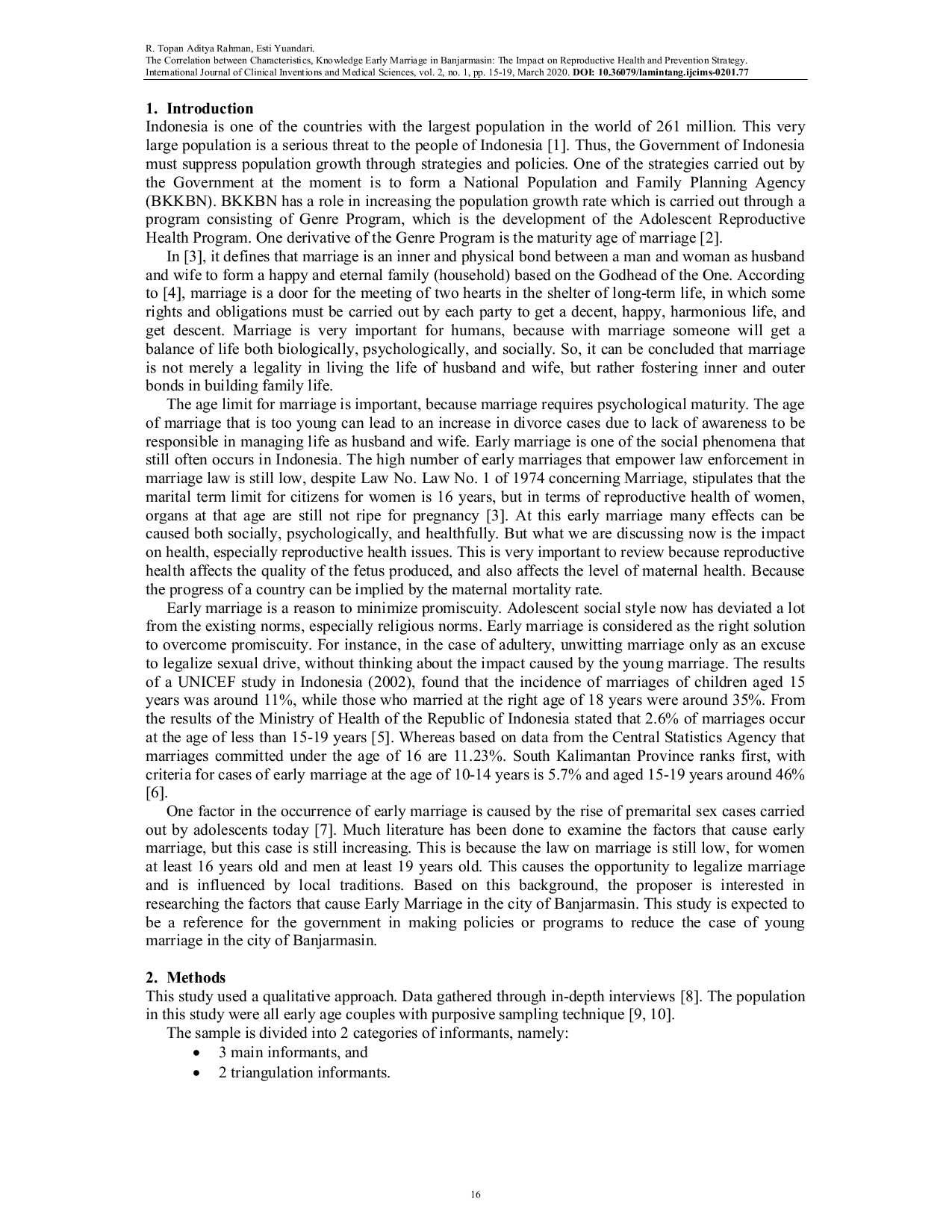International Journal of Clinical Inventions and Medical Sciences (IJCIMS)International Journal of Clinical Inventions and Medical Sciences (IJCIMS)Masalah kehamilan remaja berusia 15-19 tahun di Indonesia mencapai 10%, dan kehamilan pada usia tersebut memiliki banyak risiko komplikasi persalinan. Penelitian ini bertujuan untuk menentukan faktor penyebab, dampak pada kesehatan reproduksi, dan solusi untuk mengatasi masalah pernikahan dini. Penelitian ini menggunakan metode kualitatif dengan sampel pasangan yang menikah di usia muda. Pernikahan dini di Banjarmasin disebabkan oleh keinginan pribadi, hubungan intim, dan kehamilan pertama. Oleh karena itu, langkah strategis untuk mengatasi masalah ini adalah melalui pembinaan remaja dan kolaborasi dengan Kantor Urusan Agama. Dukungan dan peran aktif masyarakat diperlukan untuk mengurangi kasus pernikahan dini.