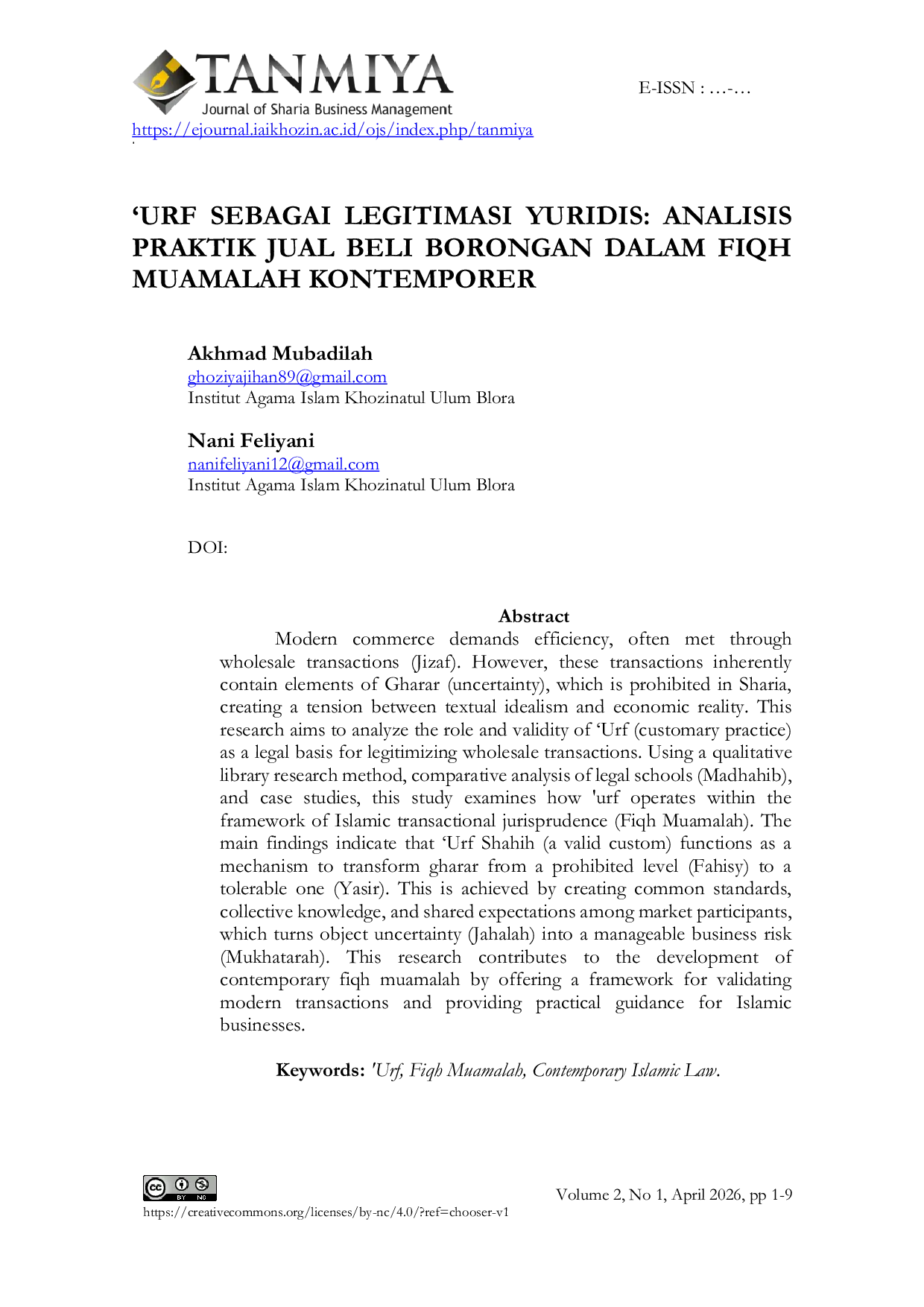 Tanmiya: Journal of Sharia Business ManagementTanmiya: Journal of Sharia Business ManagementPerdagangan modern menuntut efisiensi, yang seringkali dipenuhi melalui praktik jual beli borongan (Jizaf). Namun, transaksi ini secara inheren mengandung unsur gharar (ketidakpastian) yang dilarang dalam syariah, sehingga menciptakan ketegangan antara idealisme teks dan realitas ekonomi. Penelitian ini bertujuan untuk menganalisis peran dan validitas urf (adat kebiasaan) sebagai dasar hukum yang melegitimasi praktik jual beli borongan. Dengan menggunakan metode studi kepustakaan kualitatif, analisis komparatif mazhab, dan studi kasus, penelitian ini mengkaji bagaimana urf beroperasi dalam kerangka fiqh muamalah. Temuan utama menunjukkan bahwa Urf Shahih (adat yang valid) berfungsi sebagai mekanisme untuk mentransformasi gharar dari level terlarang (Fahisy) menjadi dapat ditoleransi (Yasir). Hal ini dicapai dengan menciptakan standar, pengetahuan kolektif, dan ekspektasi bersama di antara para pelaku pasar, yang mengubah ketidakpastian objek (Jahalah) menjadi risiko bisnis yang dapat dikelola (Mukhatarah). Penelitian ini berkontribusi pada pengembangan fiqh muamalah kontemporer dengan menawarkan kerangka kerja untuk memvalidasi transaksi modern dan memberikan panduan praktis bagi bisnis syariah.