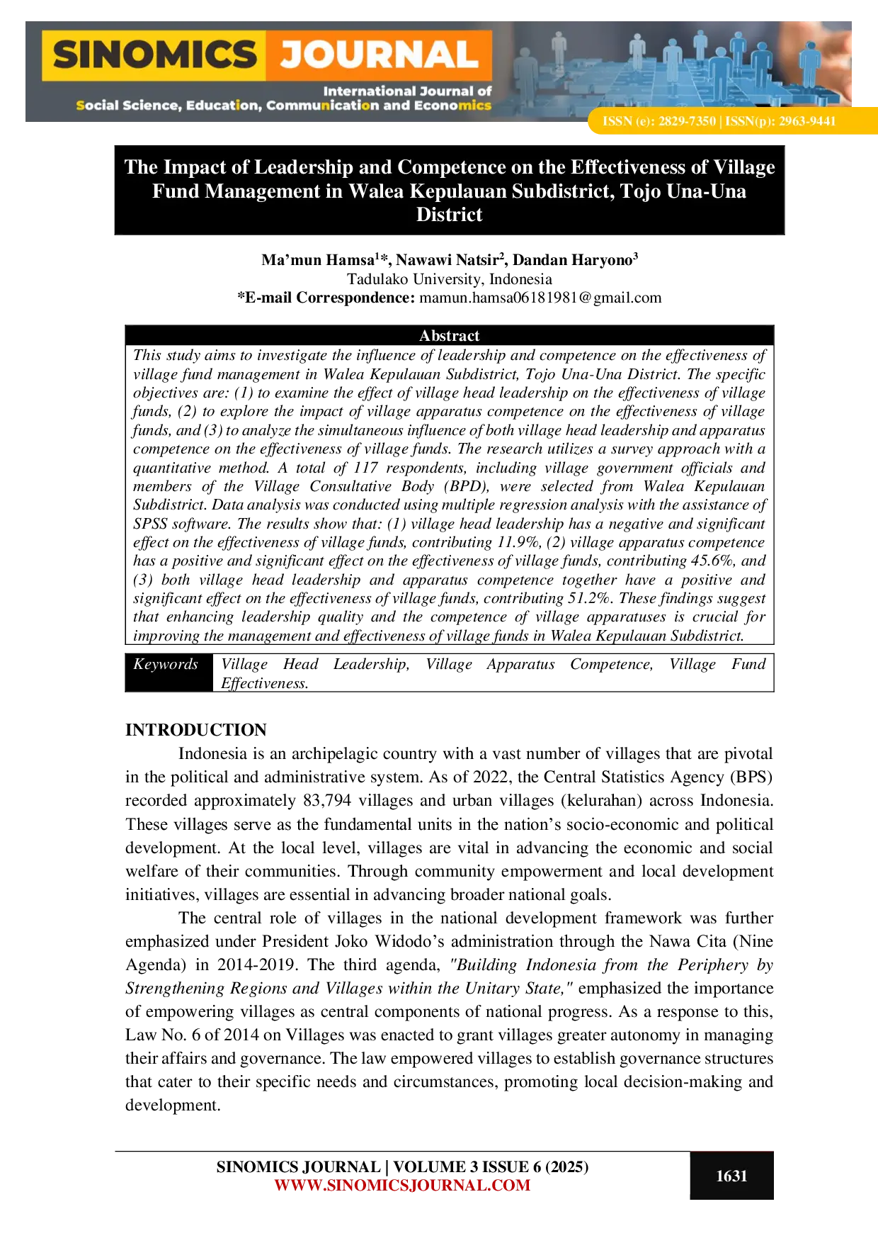 International Journal of Social Science, Education, Communication and EconomicsInternational Journal of Social Science, Education, Communication and EconomicsPenelitian ini bertujuan untuk menginvestigasi pengaruh kepemimpinan dan kompetensi terhadap efektivitas pengelolaan dana desa di Kecamatan Walea Kepulauan, Kabupaten Tojo Una-Una. Tujuan spesifiknya adalah: (1) menguji pengaruh kepemimpinan kepala desa terhadap efektivitas dana desa, (2) mengeksplorasi dampak kompetensi perangkat desa terhadap efektivitas dana desa, dan (3) menganalisis pengaruh simultan kepemimpinan kepala desa dan kompetensi perangkat desa terhadap efektivitas dana desa. Penelitian ini menggunakan pendekatan survei dengan metode kuantitatif. Sebanyak 117 responden, termasuk pejabat pemerintah desa dan anggota Badan Consultatif Desa (BPD), dipilih dari Kecamatan Walea Kepulauan. Analisis data dilakukan menggunakan analisis regresi berganda dengan bantuan perangkat lunak SPSS. Hasil penelitian menunjukkan bahwa: (1) kepemimpinan kepala desa memiliki pengaruh negatif dan signifikan terhadap efektivitas dana desa, berkontribusi sebesar 11,9%, (2) kompetensi perangkat desa memiliki pengaruh positif dan signifikan terhadap efektivitas dana desa, berkontribusi sebesar 45,6%, dan (3) baik kepemimpinan kepala desa maupun kompetensi perangkat desa secara bersama-sama memiliki pengaruh positif dan signifikan terhadap efektivitas dana desa, berkontribusi sebesar 51,2%. Temuan ini menunjukkan bahwa meningkatkan kualitas kepemimpinan dan kompetensi perangkat desa sangat penting untuk meningkatkan pengelolaan dan efektivitas dana desa di Kecamatan Walea Kepulauan.