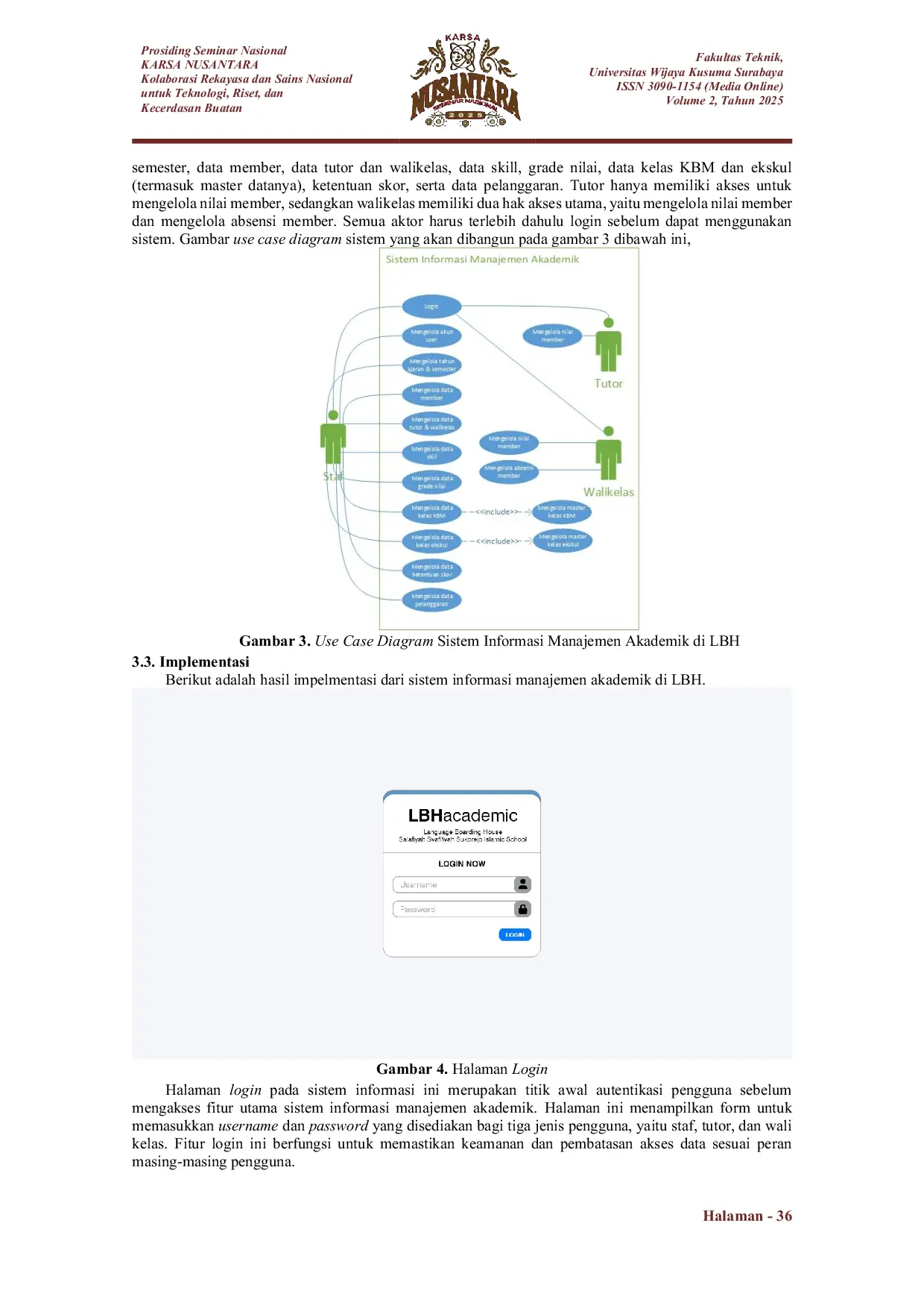 KARSA NUSANTARAKARSA NUSANTARALanguage Boarding House (LBH) di Pondok Pesantren Salafiyah Syafiiyah Sukorejo, Situbondo, merupakan asrama bahasa yang menyelenggarakan kegiatan akademik seperti KBM, ekstrakurikuler, dan pengawasan bahasa secara intensif. Namun, pengelolaan data akademik di LBH masih dilakukan secara manual melalui spreadsheet Microsoft Excel dan pencatatan kertas, yang mengakibatkan proses monitoring, analisis, dan pelaporan berjalan kurang efisien. Untuk mengatasi permasalahan tersebut, penelitian ini bertujuan merancang sistem informasi manajemen akademik berbasis web yang mampu mengintegrasikan seluruh proses bisnis akademik di LBH. Metode yang digunakan dalam pengembangan sistem adalah metode waterfall. Sistem informasi yang dihasilkan pada akhir penelitian ini telah disesuaikan dengan kebutuhan yang telah dianalisis sebelumnya. Dengan adanya sistem ini, proses yang sebelumnya dilakukan secara manual kini dapat dilakukan secara terintegrasi dan digital. Hal ini berdampak pada peningkatan efisiensi kerja staf, akurasi data yang lebih terjaga, serta kemudahan dalam pemantauan dan evaluasi perkembangan akademik member secara sistematis.