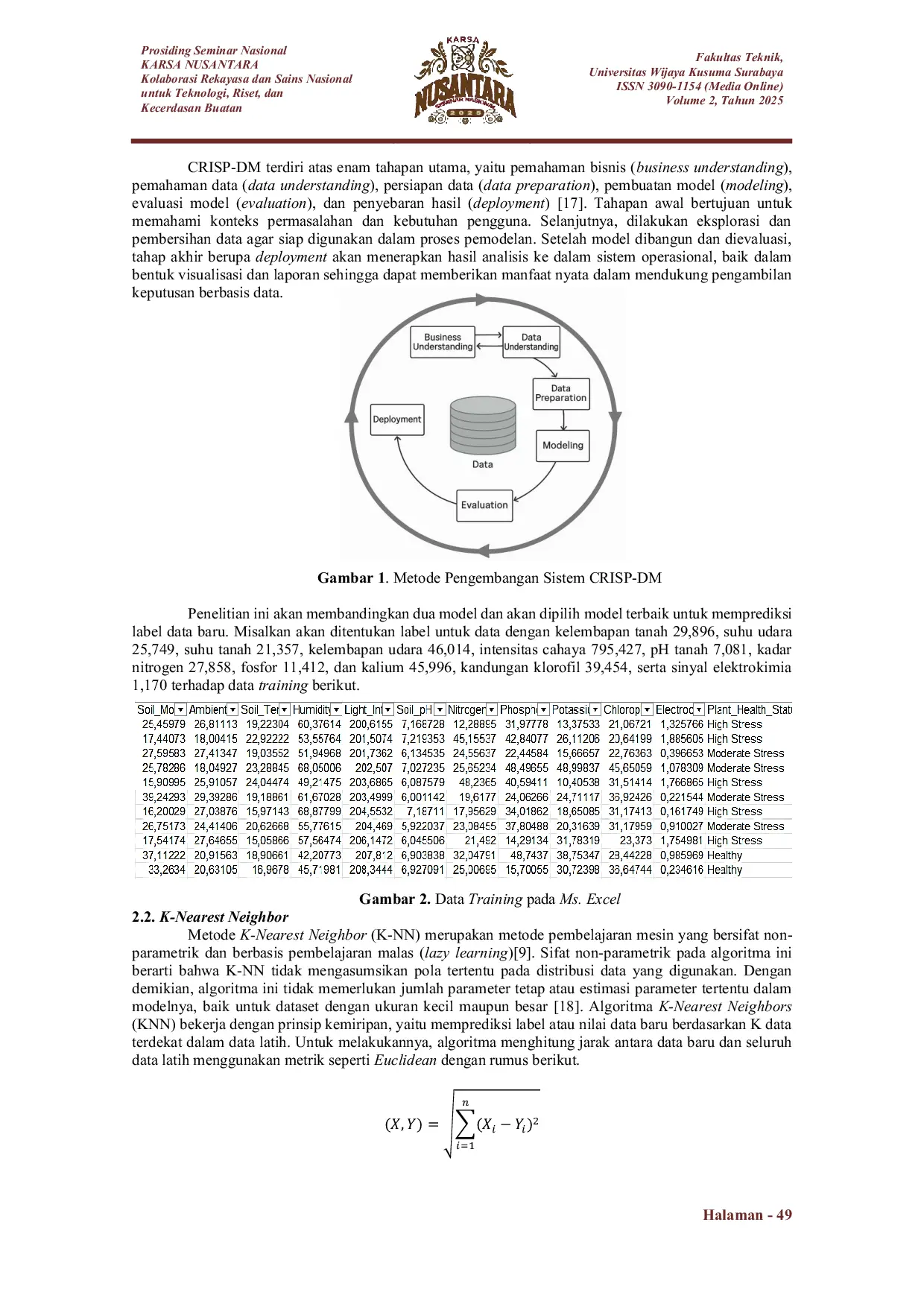 KARSA NUSANTARAKARSA NUSANTARATujuan dari penelitian ini yakni untuk membandingkan efektivitas dua metode klasifikasi, K-Nearest Neighbor (K-NN) dan Naïve Bayes, dalam memantau kesehatan tanaman berdasarkan data lingkungan seperti suhu, kelembapan, intensitas cahaya, dan kandungan unsur hara lainnya. Penelitian ini menggunakan metode CRISP-DM untuk memfasilitasi proses analisis data secara terstruktur, mulai dari identifikasi kebutuhan hingga implementasi hasil. Hasil penelitian menunjukkan bahwa Naïve Bayes mencapai akurasi lebih tinggi sebesar 76,25%, sementara K-NN menunjukkan akurasi sebesar 52,92%. Hasil ini menunjukkan bahwa metode Naïve Bayes dengan pendekatan berbasis probabilistik lebih efektif dalam memantau kesehatan tanaman dan dapat digunakan sebagai solusi dalam pengelolaan pertanian berbasis teknologi.