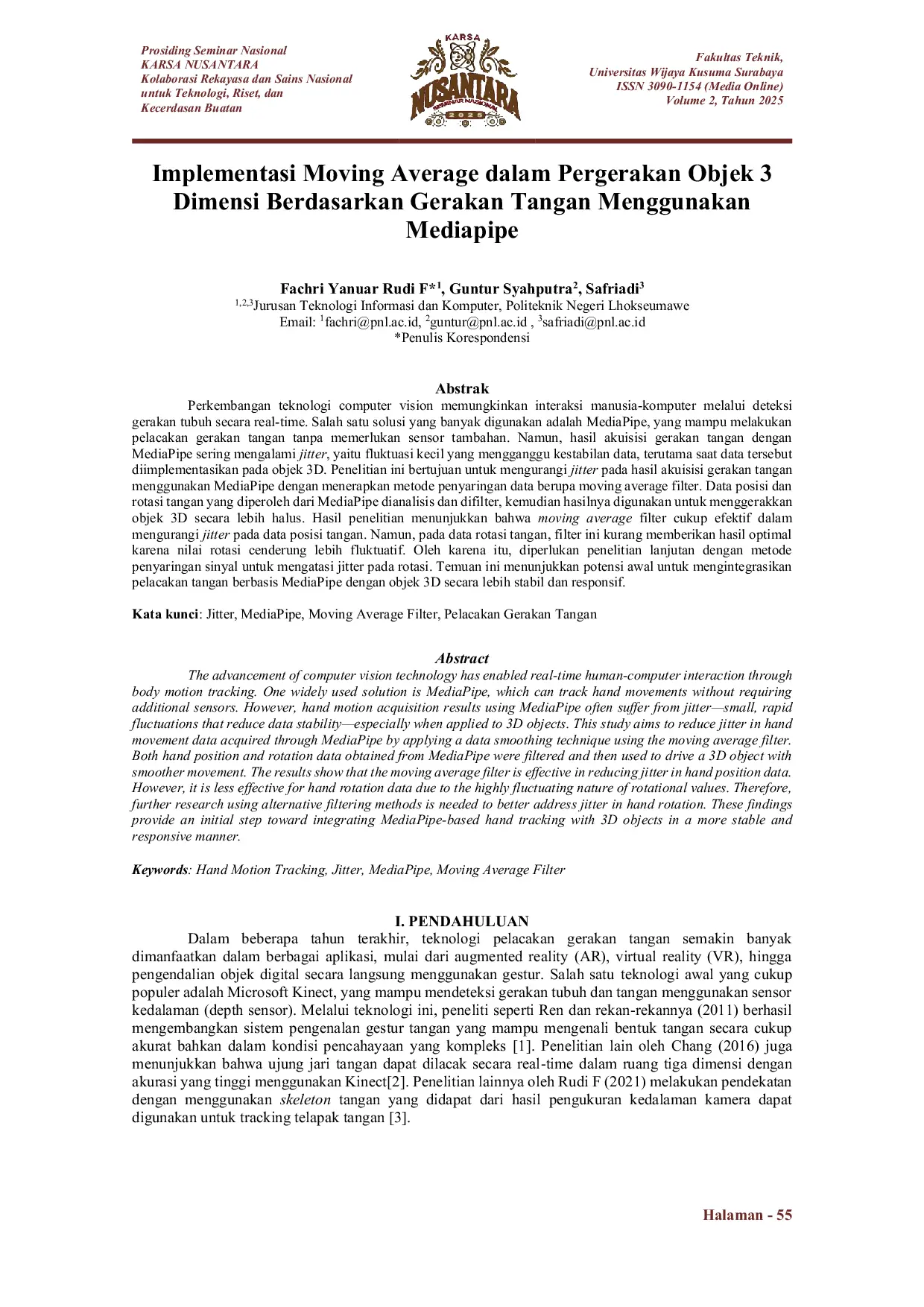 KARSA NUSANTARAKARSA NUSANTARAPerkembangan teknologi computer vision memungkinkan interaksi manusia-komputer melalui deteksi gerakan tubuh secara real-time. Salah satu solusi yang banyak digunakan adalah MediaPipe, yang mampu melakukan pelacakan gerakan tangan tanpa memerlukan sensor tambahan. Namun, hasil akuisisi gerakan tangan dengan MediaPipe sering mengalami jitter, yaitu fluktuasi kecil yang mengganggu kestabilan data, terutama saat data tersebut diimplementasikan pada objek 3D. Penelitian ini bertujuan untuk mengurangi jitter pada hasil akuisisi gerakan tangan menggunakan MediaPipe dengan menerapkan metode penyaringan data berupa moving average filter. Data posisi dan rotasi tangan yang diperoleh dari MediaPipe dianalisis dan difilter, kemudian hasilnya digunakan untuk menggerakkan objek 3D secara lebih halus. Hasil penelitian menunjukkan bahwa moving average filter cukup efektif dalam mengurangi jitter pada data posisi tangan. Namun, pada data rotasi tangan, filter ini kurang memberikan hasil optimal karena nilai rotasi cenderung lebih fluktuatif. Oleh karena itu, diperlukan penelitian lanjutan dengan metode penyaringan sinyal untuk mengatasi jitter pada rotasi. Temuan ini menunjukkan potensi awal untuk mengintegrasikan pelacakan tangan berbasis MediaPipe dengan objek 3D secara lebih stabil dan responsif.