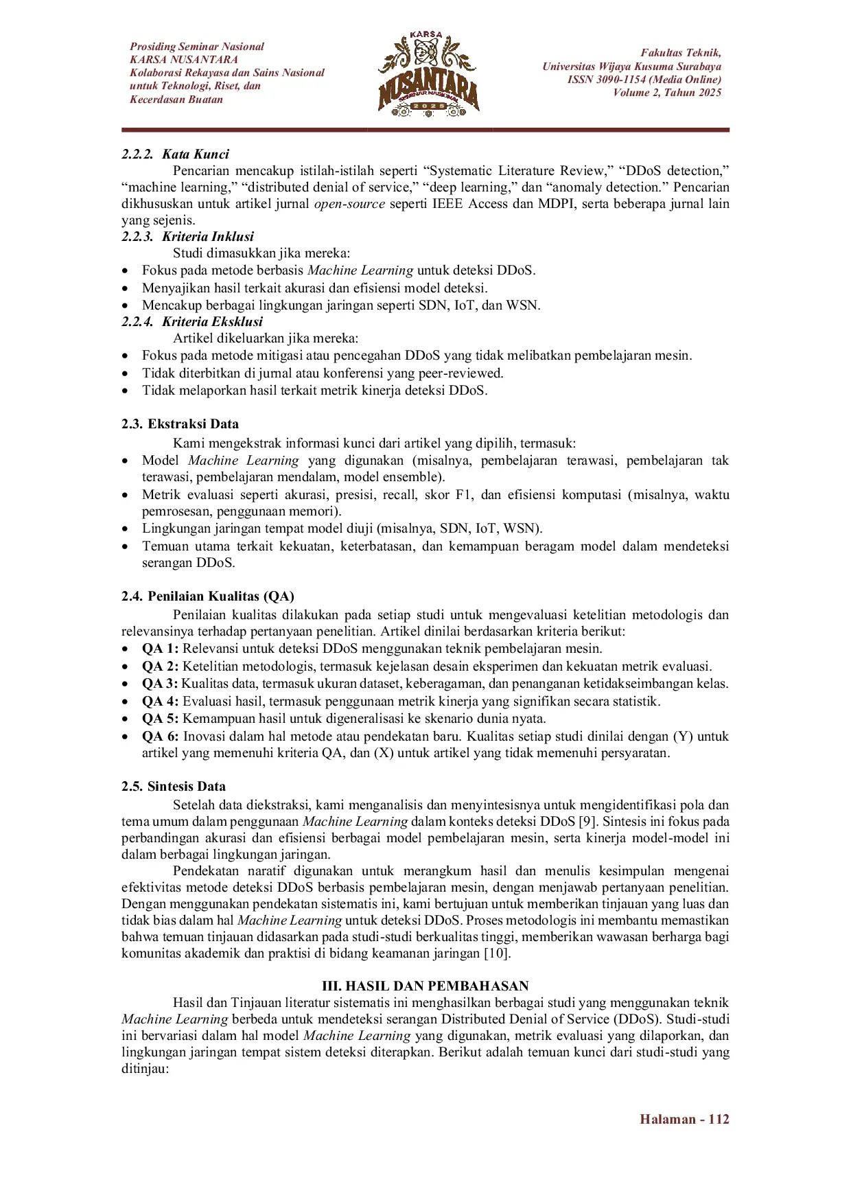 Dari penelitian yang kami lakukan, dapat diambil kesimpulan sebagai berikut.Efektivitas Metode Machine Learning dalam Deteksi DDoS (RQ1).Model pembelajaran mesin, khususnya CNN dan LSTM, terbukti sangat efektif dalam mendeteksi serangan DDoS dengan akurasi tinggi di berbagai lingkungan jaringan, termasuk SDN dan IoT.Meskipun demikian, meskipun model ini sangat akurat, mereka menghadapi tantangan dalam hal efisiensi komputasi dan memori, yang menghambat penerapan mereka pada jaringan berskala besar dengan lalu lintas tinggi.Tantangan dalam Skalabilitas dan Pola Serangan yang Berkembang (RQ2).Skalabilitas menjadi tantangan utama ketika jumlah data dan kompleksitas serangan meningkat.Terutama di lingkungan dinamis seperti SDN dan IoT, model pembelajaran mesin mengalami kesulitan dalam menangani volume besar lalu lintas yang diperlukan untuk deteksi waktu nyata.Selain itu, serangan DDoS yang terus berkembang, termasuk serangan berbasis rendah dan teknik amplifikasi, mempersulit kemampuan model dalam mendeteksi ancaman baru.Metode Machine Learning yang Menjanjikan untuk Deteksi DDoS (RQ3).Teknik yang paling menjanjikan untuk deteksi DDoS termasuk pembelajaran mendalam (CNN, LSTM), model hibrida (seperti Autoencoder dengan LSTM), dan pembelajaran ensemble (seperti Random Forest dan XGBoost).Selain itu, pendekatan federated learning juga menunjukkan potensi besar untuk mengatasi masalah terkait privasi data dan skalabilitas, memungkinkan pelatihan model di beberapa domain tanpa berbagi data sensitif.