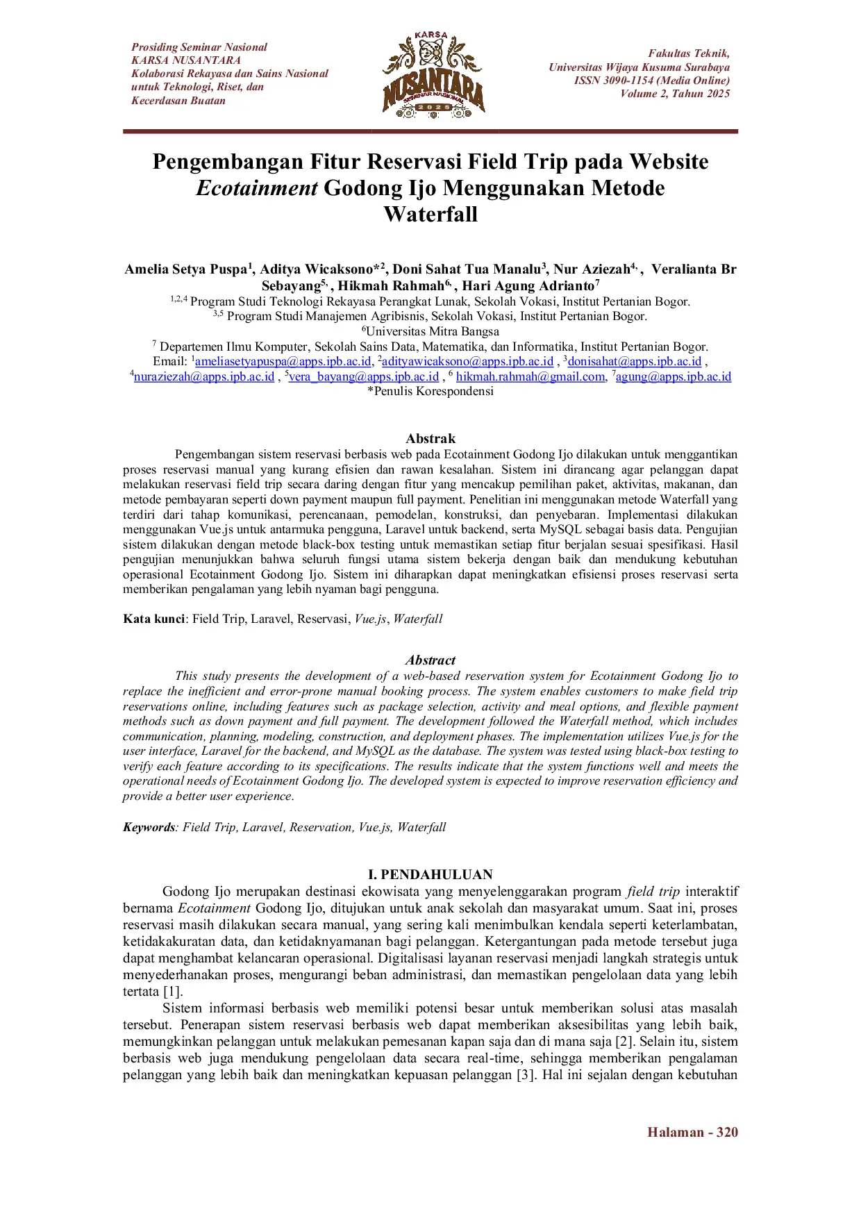 KARSA NUSANTARAKARSA NUSANTARAPengembangan sistem reservasi berbasis web pada Ecotainment Godong Ijo dilakukan untuk menggantikan proses reservasi manual yang kurang efisien dan rawan kesalahan. Sistem ini dirancang agar pelanggan dapat melakukan reservasi field trip secara daring dengan fitur yang mencakup pemilihan paket, aktivitas, makanan, dan metode pembayaran seperti down payment maupun full payment. Penelitian ini menggunakan metode Waterfall yang terdiri dari tahap komunikasi, perencanaan, pemodelan, konstruksi, dan penyebaran. Implementasi dilakukan menggunakan Vue.js untuk antarmuka pengguna, Laravel untuk backend, serta MySQL sebagai basis data. Pengujian sistem dilakukan dengan metode black-box testing untuk memastikan setiap fitur berjalan sesuai spesifikasi. Hasil pengujian menunjukkan bahwa seluruh fungsi utama sistem bekerja dengan baik dan mendukung kebutuhan operasional Ecotainment Godong Ijo. Sistem ini diharapkan dapat meningkatkan efisiensi proses reservasi serta memberikan pengalaman yang lebih nyaman bagi pengguna.