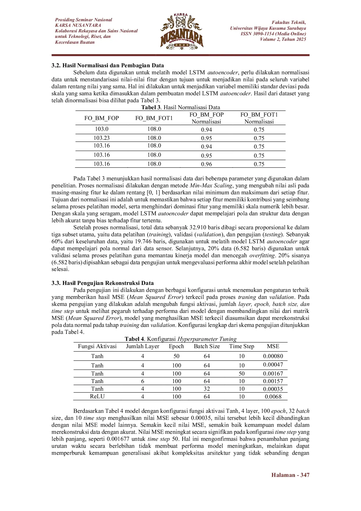 KARSA NUSANTARAKARSA NUSANTARAPembangkit Listrik Tenaga Mesin Gas (PLTMG) memanfaatkan sensor suhu dan tekanan untuk memantau kondisi operasional. Sistem keamanan konvensional yang menggunakan ambang batas tetap sering kali tidak mampu mengidentifikasi gejala awal gangguan sebelum mencapai kondisi kritis. Penelitian ini mengusulkan pengembangan sistem deteksi anomali berbasis metode Long Short-Term Memory (LSTM) Autoencoder sebagai solusi yang lebih adaptif. Data sensor dikumpulkan melalui protokol MQTT dan disimpan dalam database, kemudian diproses melalui tahap pra‑pemrosesan, normalisasi, dan pembentukan data berurutan (time series). Model dilatih untuk mengenali pola normal dan mengidentifikasi deviasi melalui nilai reconstruction loss. Hasil pengujian menunjukkan bahwa konfigurasi model optimal menghasilkan nilai MSE terendah sebesar 0.00035 dengan kemampuan yang baik dalam mendeteksi anomali pada data yang sebelumnya tidak dikenali. Sistem ini terbukti efektif memberikan peringatan dini dan berpotensi mengurangi risiko kerusakan maupun gangguan operasional.