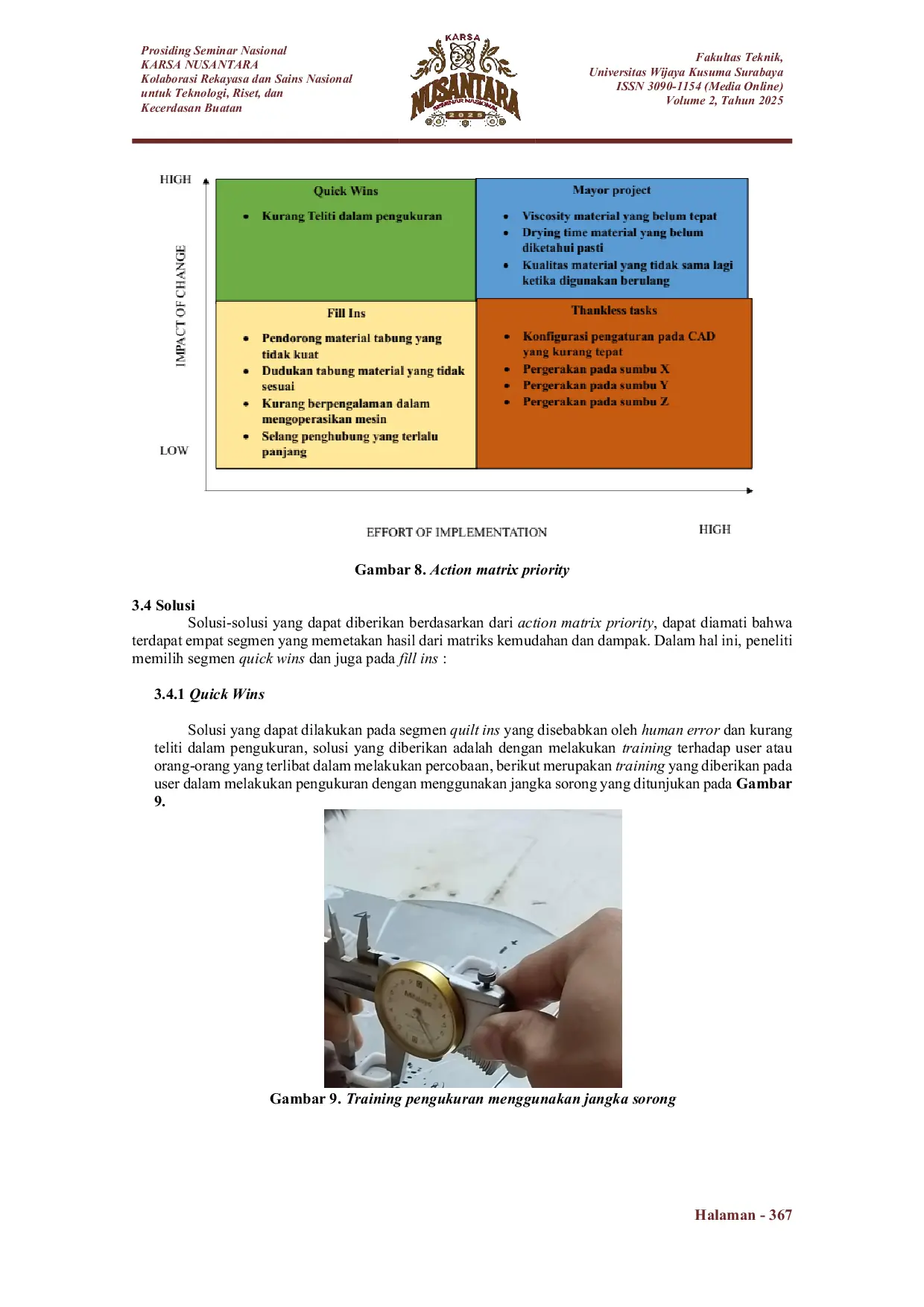 KARSA NUSANTARAKARSA NUSANTARAPerkembangan teknologi pencetakan 3D atau bisa kita sebut 3D printing telah menunjukkan kemajuan, terutama dalam sektor kesehatan, contohnya digunakan dalam memproduksi tulang akibat kerusakan atau cedera yang dialami. Salah satu tipe pencetakan 3D yang digunakan adalah berbasis direct-ink writing. Material yang pakai berbentuk slurry dan alat 3D printer Eazao Zero, sebelum itu, perlu dilakukan optimasi parameter proses mesin terlebih dahulu, optimasi tersebut menggunakan metode RSM. Namun, dalam pelaksanaannya, hasil cetakan mengalami perbedaan hasil printing dengan desain CAD. Oleh karena itu, perlu dilakukan analisis untuk mengetahui penyebab error dimensi tersebut. Metode yang dipakai root cause analysis dengan menggunakan diagram tulang ikan atau disebut diagram Ishikawa. Hasil analisis menggunakan diagram Ishikawa menunjukkan pada action matrix priority, kuadran quick wins mengidentifikasi permasalahan yang mudah diselesaikan dan memiliki dampak signifikan, yaitu kurangnya ketelitian dalam pengukuran. Solusi yang diusulkan adalah memberikan pelatihan untuk melakukan pengukuran dengan lebih teliti. Pada kuadran fill-ins mengidentifikasi permasalahan yang juga mudah diselesaikan namun tidak memberikan dampak signifikan, antara lain: pendorong material tabung yang tidak kuat untuk mendorong material keluar, dudukan tabung material tidak sesuai, selang penghubung terlalu panjang. Solusi yang diusulkan adalah dengan mengganti tabung dengan bahan yang lebih kuat, mengganti dudukan tabung material, menggunakan selang penghubung yang lebih pendek.