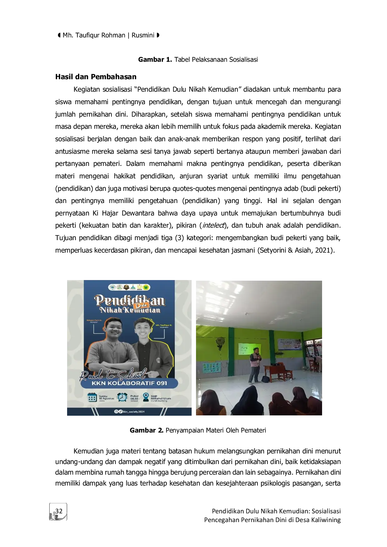 Berinilah penelitian kuantitatif untuk menilai dampak jangka panjang sosialisasi Pendidikan Dulu Nikah Kemudian terhadap tingkat kelulusan siswa ke perguruan tinggi di wilayah lain, serta mengukur perubahan perilaku sosial mereka. Selanjutnya, lakukan studi kebijakan untuk menganalisis efektivitas regulasi pernikahan minimum usia di desa Kota Kaliwining, memperhatikan faktor ekonomi dan budaya, guna menyesuaikan intervensi preventif. Terakhir, jelajahi potensi integrasi program sosialisasi ini dengan pelatihan keterampilan kerja bagi remaja, sehingga memperkuat sinergi antara pendidikan formal dan peningkatan kemandirian ekonomi remaja.