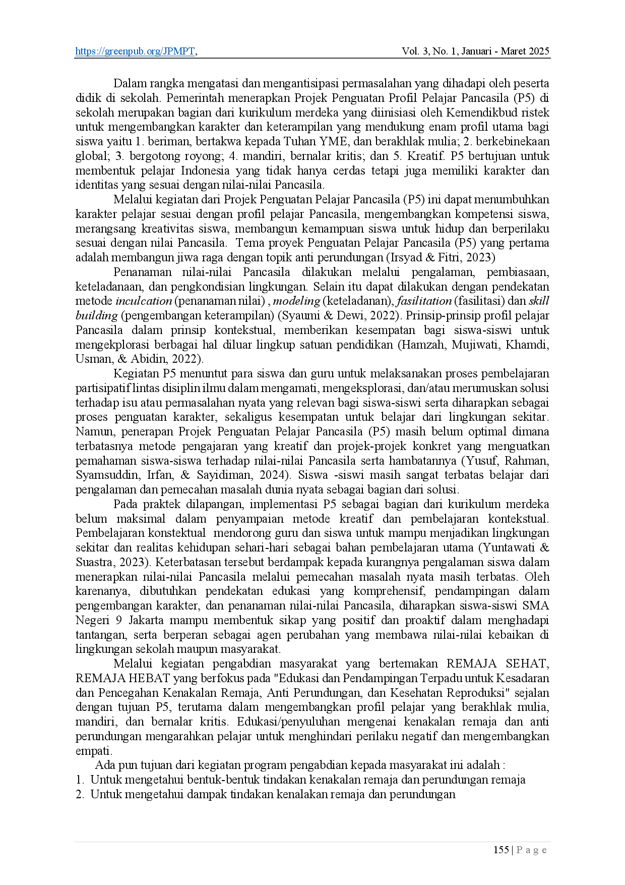 Jurnal Pengabdian Masyarakat dan Penelitian TerapanJurnal Pengabdian Masyarakat dan Penelitian TerapanRemaja berada dalam fase kritis perkembangan kehidupan mereka, di mana pembentukan karakter, nilai, dan identitas pribadi sedang berlangsung dengan cepat. Masalah-masalah kenakalan remaja di sekolah mencakup berbagai tindakan seperti pelanggaran tata tertib, perilaku kekerasan, seks bebas hingga konsumsi zat-zat terlarang. Dalam rangka mengatasi dan mengantisipasi permasalahan yang dihadapi oleh peserta didik di sekolah, pemerintah menerapkan Projek Penguatan Profil Pelajar Pancasila (P5) di sekolah merupakan bagian dari kurikulum merdeka. Implementasi P5 sebagai bagian dari kurikulum merdeka belum maksimal dalam penyampaian metode kreatif dan pembelajaran kontekstual. Keterbatasan tersebut berdampak kepada kurangnya pengalaman siswa dalam menerapkan nilai-nilai Pancasila melalui pemecahan masalah nyata masih terbatas. Melalui kegiatan pengabdian kepada masyarakat ini para peserta didik semakin bertambah pengalaman terkait pembelajaran konseptual. Metode yang digunakan adalah penyuluhan melalui kegiatan workshop dengan menyampaikan studi kasus, tanya jawab atau diskusi, role play dan memberikan evaluasi serta tindak lanjut. Kegiatan ini dihadiri 237 peserta dan guru-guru di sekolah SMAN 9 Jakarta. Hasil dari kegiatan ini para peserta didik mengetahui bentuk-bentuk tindakan kenakalan remaja serta menjaga kesehatan reproduksi remaja. Sebanyak 98,5% dari para peserta didik juga bersedia untuk melaporkan segala bentuk tindakan bullying serta membantu teman dalam menjaga kesehatan reproduksi.