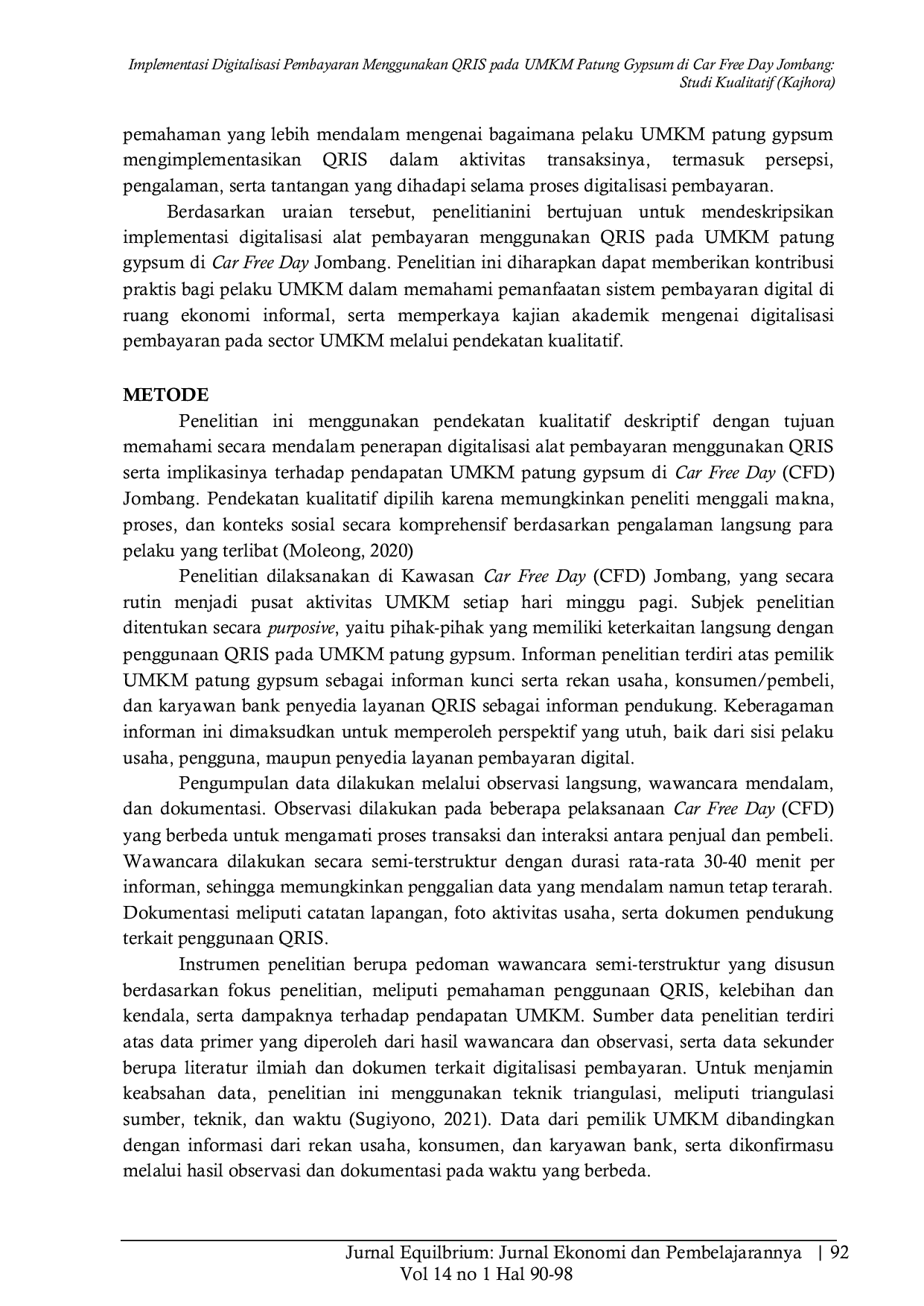 EQUILIBRIUM : Jurnal Ilmiah Ekonomi dan PembelajarannyaEQUILIBRIUM : Jurnal Ilmiah Ekonomi dan PembelajarannyaPenelitian ini bertujuan menganalisis penerapan Quick Response Code Indonesian Standard (QRIS) serta implikasinya terhadap pendapatan UMKM patung gypsum di Car Free Day (CFD) Jombang. Penelitian dilakukan pada tahun 2025 menggunakan pendekatan kualitatif deskriptif. Data dikumpulkan melalui wawancara mendalam, observasi, dan dokumentasi terhadap lima informan yang terdiri dari dua pelaku UMKM, dua konsumen, dan satu informan pendukung dari sektor perbankan. Hasil penelitian menunjukkan bahwa penggunaan QRIS membantu meningkatkan kelancaran transaksi dan kenyamanan pembayaran, terutama bagi konsumen yang terbiasa menggunakan pembayaran non-tunai. Dari sudut pandang pelaku usaha, QRIS dipersepsikan dapat menjaga kontinuitas transaksi dan mengurangi potensi kehilangan penjualan, khususnya pada periode Car Free Day (CFD) yang ramai. Bentuk peningkatan pendapatan tercermin dalam persepsi pelaku usaha dan tren peningkatan jumlah transaksi, meskipun belum bersifat signifikan secara kuantitatif. Selain itu, pencatatan transaksi otomatis melalui QRIS mempermudah pemantauan omzet usaha. Meskipun masih menghadapi kendala berupa keterbatasan literasi digital dan gangguan jaringan internet, penelitian ini menunjukkan bahwa QRIS berperan sebagai instrumen pendukung adaptasi UMKM informal terhadap transformasi digital.