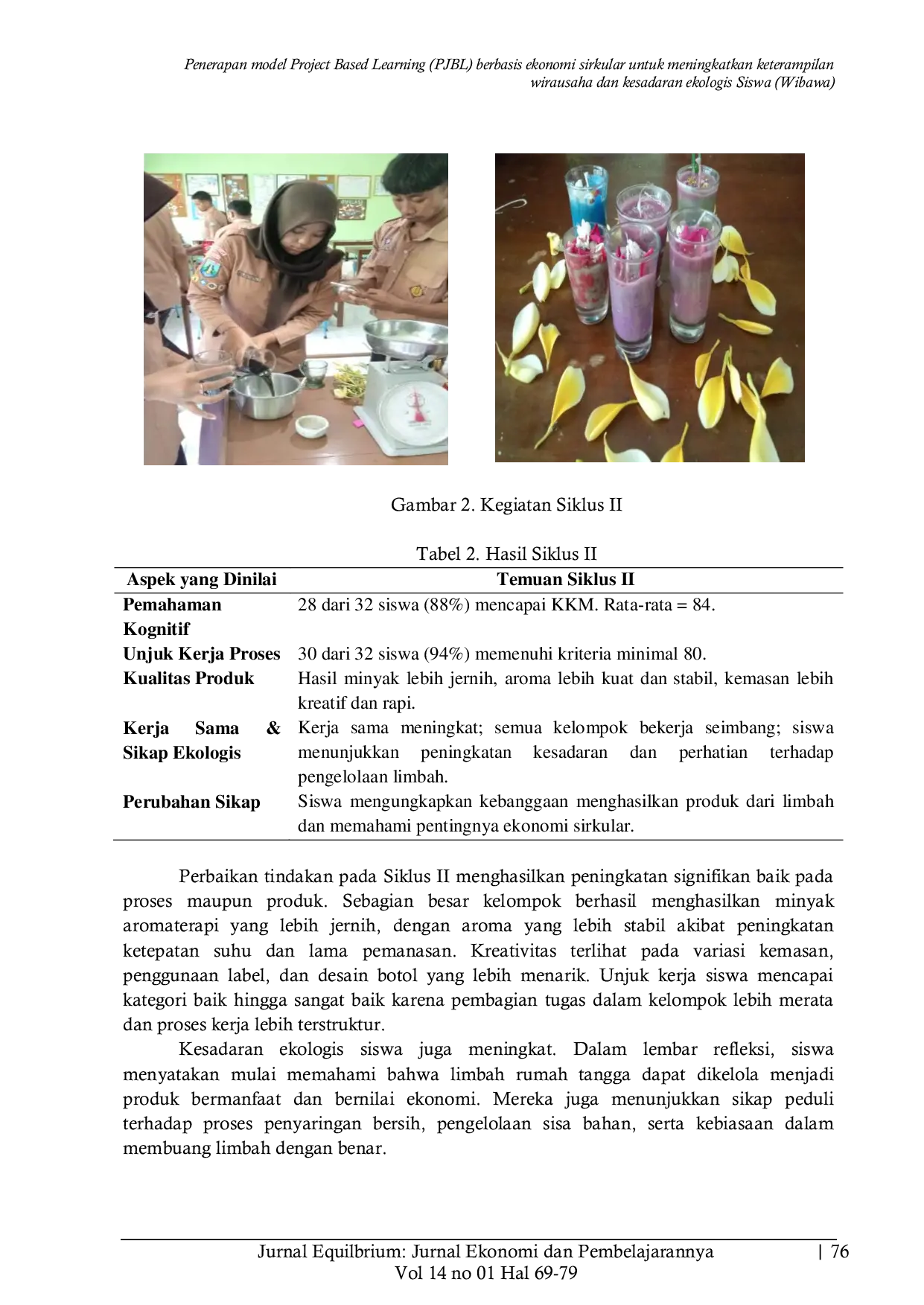 EQUILIBRIUM : Jurnal Ilmiah Ekonomi dan PembelajarannyaEQUILIBRIUM : Jurnal Ilmiah Ekonomi dan PembelajarannyaModel Project Based Learning (PjBL) dipandang relevan untuk mengembangkan keterampilan wirausaha sekaligus menumbuhkan kesadaran ekologis siswa. Penelitian ini bertujuan untuk meningkatkan keterampilan wirausaha dan kesadaran ekologis siswa melalui penerapan PjBL berbasis ekonomi sirkular dalam proyek pembuatan minyak aromaterapi dari minyak jelantah. Penelitian menggunakan metode Penelitian Tindakan Kelas model Kemmis dan McTaggart, dilaksanakan dalam dua siklus pada siswa kelas XII SMA Negeri 1 Sukomoro. Data dikumpulkan melalui tes kognitif, observasi unjuk kerja, penilaian produk, dan angket refleksi siswa, kemudian dianalisis secara kuantitatif dan kualitatif. Hasil penelitian menunjukkan peningkatan yang signifikan pada aspek kognitif, kualitas produk minyak aromaterapi, dan keterampilan proses siswa dari Siklus I ke Siklus II. Selain itu, siswa menunjukkan peningkatan kreativitas, kemampuan kolaborasi, serta sikap peduli lingkungan yang ditunjukkan melalui refleksi dan perubahan perilaku dalam mengelola limbah. Kesimpulannya, penerapan PjBL berbasis ekonomi sirkular efektif meningkatkan keterampilan wirausaha dan kesadaran ekologis siswa.