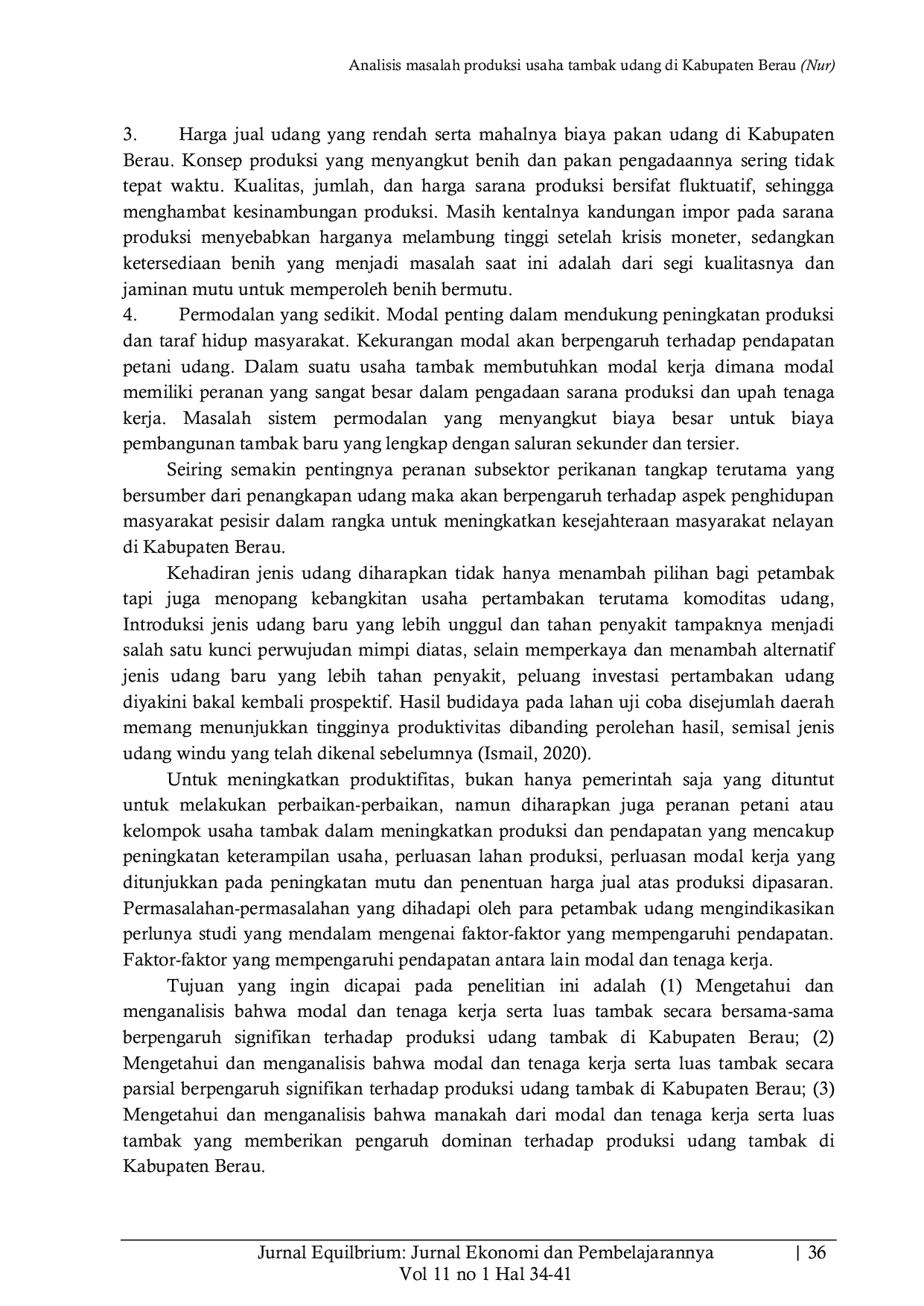 EQUILIBRIUM : Jurnal Ilmiah Ekonomi dan PembelajarannyaEQUILIBRIUM : Jurnal Ilmiah Ekonomi dan PembelajarannyaPermasalahan dalam penelitian ini adalah kecenderungan produksi udang yang tidak diikuti dengan peningkatan nilai tambah produksi udang yang dihasilkan. Produksi tambak udang di Kabupaten Berau belum maksimal; harga jual udang rendah, biaya pakan tinggi, dan modal terbatas. Tujuan penelitian ini adalah mengetahui dan menganalisis pengaruh modal, tenaga kerja, serta luas tambak secara bersama‑sama dan parsial terhadap produksi tambak udang di Kabupaten Berau. Metode yang digunakan adalah fungsi produksi Cobb‑Douglas. Hasil perhitungan menunjukkan bahwa modal, tenaga kerja, dan luas tambak secara bersama‑sama berpengaruh signifikan terhadap produksi udang tambak, dengan nilai koefisien determinasi mencapai 0,920.