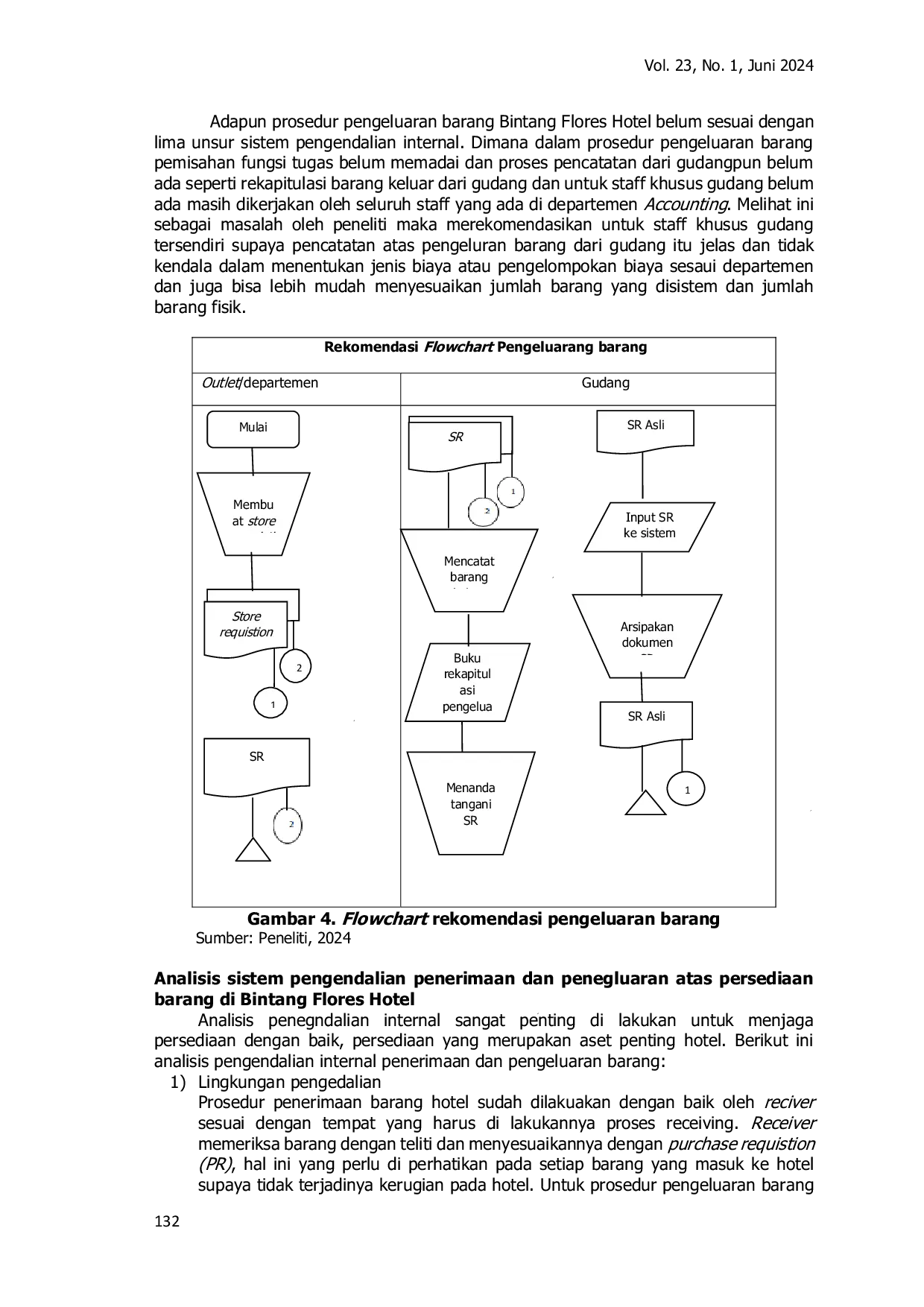Berdasarkan hasil penelitian analisis pengendalian internal penerimaan dan penegluaran atas persediaan barang di Bintang Flores Hotel, Prosedur penerimaan barang di Bintang Flores Hotel belum sesuai dengan unsur sistem penegndalian internal dimana belum adanya pemisahan tugas atau fungsi di bagian penerimaan barang seperti staff receiving merangkap dengan purchasing dan untuk bagian store masih di pegang seluruh oleh staff accounting.Dalam proses penerimaan barangpun masih belum terlihat aktivitas pengendalian dan pemantaun yang baik seperti fugsi cost controll yang harusnya mengewasi receiver dalam proses receiving barang yang masuk ke hotel.Terlihat juga dalam meniladi resiko seperti penggunaan dokumen yang digunakan dalam proses penerimaan yaitu tidak adanya Purchase Order yang digunakan oleh Receiver hanya menggunakan Purchase Requistion saja yang di didapatkan dari Setiap Outlet atau departemen yang memesan barang.Harusnya ada PO karena dokumen ini sebagai tanda sah pemesan barang yang dilkuakan purchasing ke supplier.Purchase order juga sebagai dokumen pendukung untuk bisa mencocokan nama, harga dan jumlah barang dengan faktur yang dibawahkan oleh supplier.Adapun Prosedur penegluaran barang gudang, pada prosedur ini juga belum diterapkan dengan baik, dimana dalam proses ini masih belum adanya pemisahan tugas yang jelas dan untuk pencatatan dalam melakukan pengeluaran barang gudang tidak ada seperti pembuatan bin card atau kartu gudang dan rekapitulasi jenis setiap barang yang dikeluarkan, sehingga pada saat melakukan inventory pada akhir bulan selalu terjadi selisih antara jumlah barang fisik dengan jumlah yang ada di sistem yang digunakan hotel.dilihat dari prosedur penerimaan dan pengeluaran barang Sistem pengendalian belum diterapkan secara maksimal di Bintang Flores Hotel, karena masih adanya kekeliruan dalam prosedur penerimaan dan pengeluaran barang seperti dokumen yang digunakan hotel pada saat melakukan departemen accounting kerjanya merangkap.Begitupun pada proses pengeluran barang belum adanya pemantaun khusus yang dilkukan oleh bagian cost controll terhadap receiving.
