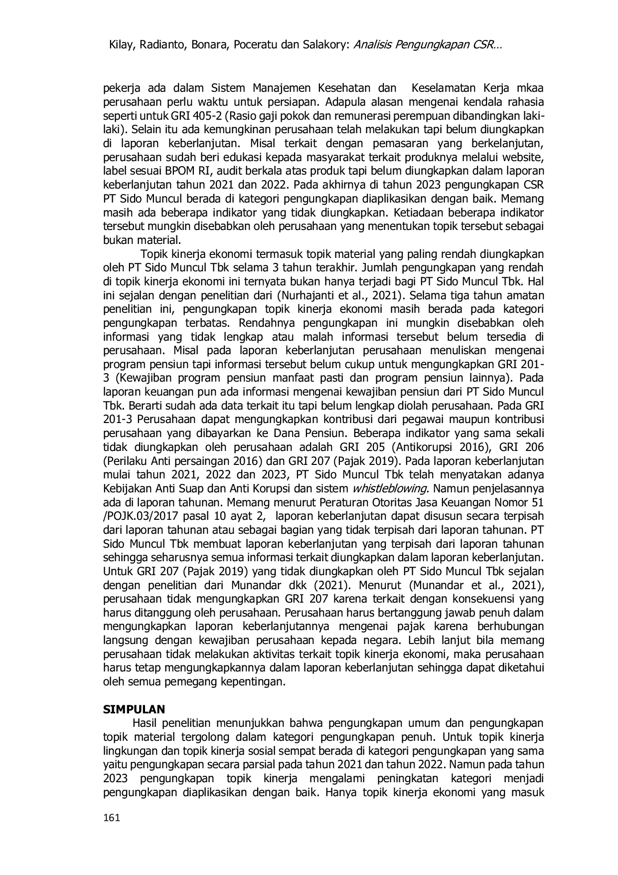 Hasil penelitian menunjukkan bahwa pengungkapan umum dan pengungkapan topik material tergolong dalam kategori pengungkapan penuh.Untuk topik kinerja lingkungan dan topik kinerja sosial sempat berada di kategori pengungkapan yang sama yaitu pengungkapan secara parsial pada tahun 2021 dan tahun 2022.Namun pada tahun 2023 pengungkapan topik kinerja mengalami peningkatan kategori menjadi pengungkapan diaplikasikan dengan baik.Hanya topik kinerja ekonomi yang masuk dalam kategori paling rendah yaitu pengungkapan terbatas mulai dari tahun 2021 sampai dengan tahun 2023.Perusahaan perlu terus berupaya meningkatkan kualitas pengungkapan CSR, terutama pada topik kinerja ekonomi, agar dapat memberikan informasi yang lebih komprehensif kepada para pemangku kepentingan.