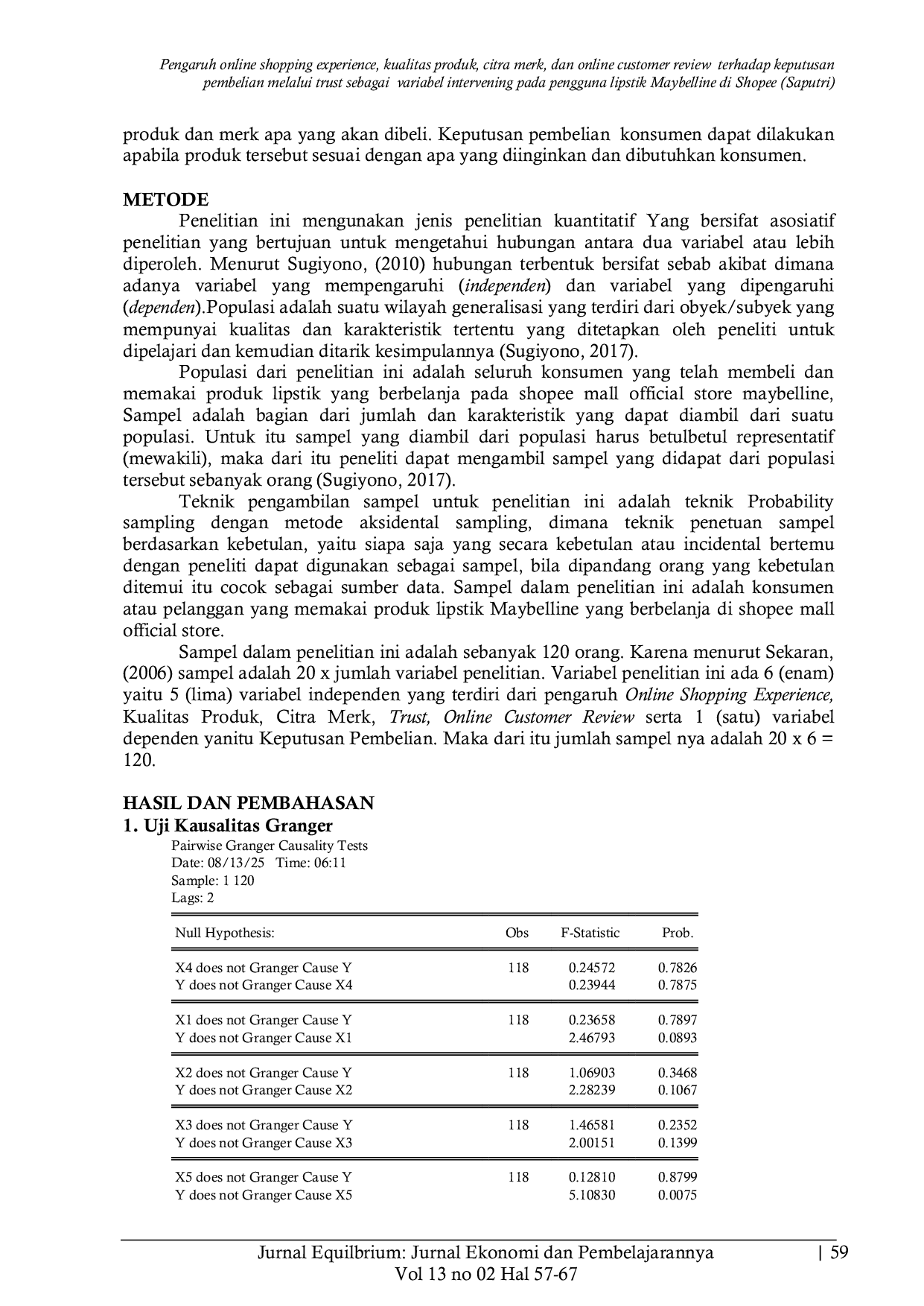 EQUILIBRIUM : Jurnal Ilmiah Ekonomi dan PembelajarannyaEQUILIBRIUM : Jurnal Ilmiah Ekonomi dan PembelajarannyaPenelitian ini bertujuan untuk menganalisis sembilan hubungan kausal, yaitu pengaruh online shopping experience, kualitas produk, citra merek, trust, dan online customer reviews terhadap keputusan pembelian, serta pengaruh online shopping experience, kualitas produk, citra merek, dan online customer reviews terhadap trust pada pengguna lipstik Maybelline di Shopee. Hasil penelitian menunjukkan bahwa sebagian besar variabel berpengaruh signifikan terhadap keputusan pembelian maupun trust, baik secara positif maupun negatif, dengan pengecualian online shopping experience terhadap trust yang tidak signifikan.