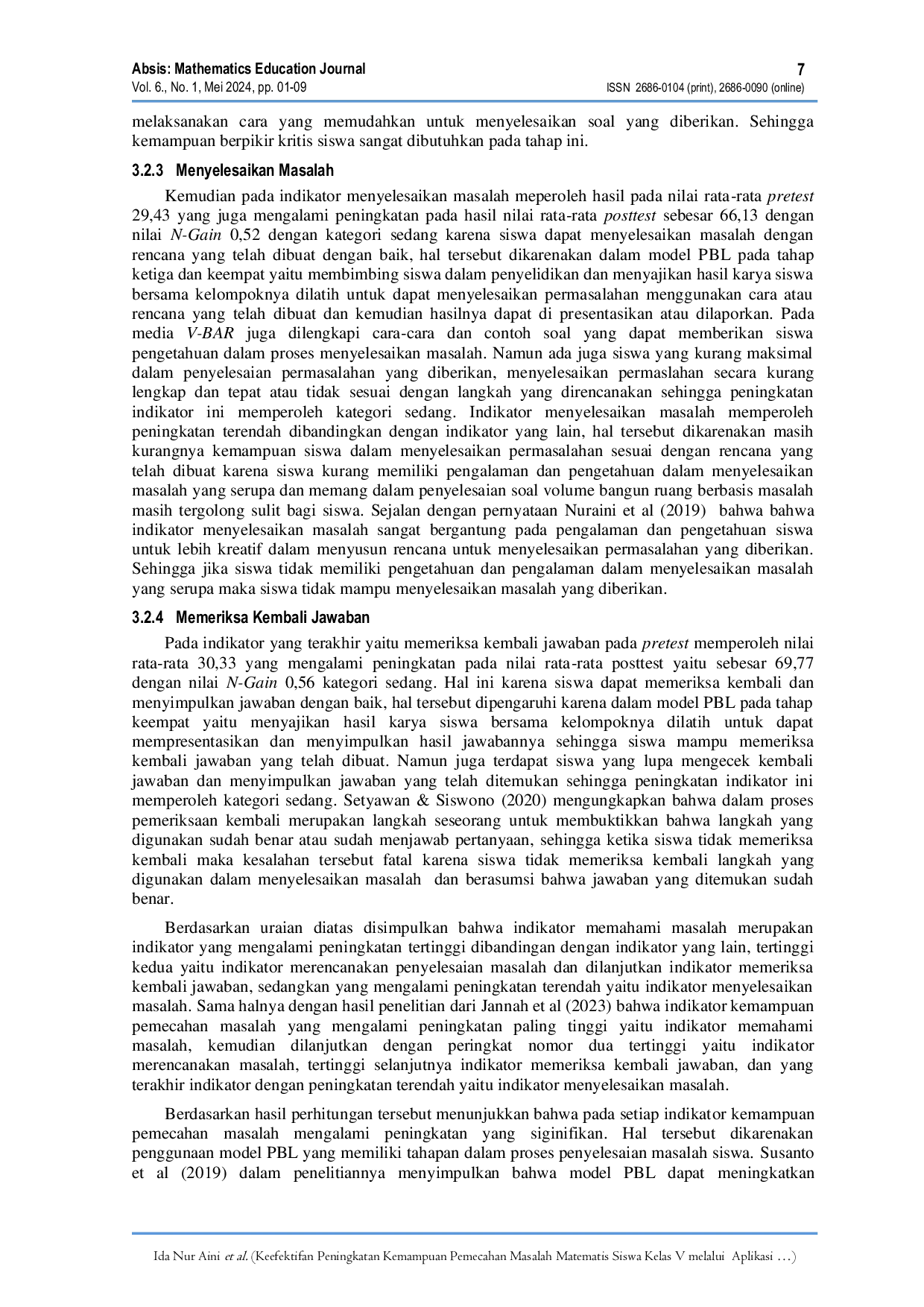 Absis: Mathematics Education JournalAbsis: Mathematics Education JournalPenelitian ini bertujuan menentukan efektivitas peningkatan kemampuan pemecahan masalah matematika siswa kelas V SD N Sidomulyo 3 melalui penggunaan aplikasi V-BAR berbasis Android dan model PBL. Metode kuantitatif eksperimental satu kelompok pretest‑posttest diterapkan pada 22 siswa. Data dikumpulkan melalui tes kemampuan pemecahan masalah. Analisis menggunakan statistik N-Gain Score menunjukkan peningkatan kemampuan sebesar 61,22 % (kategori sedang). Hasil posttest rata‑rata 74,6, meningkat 40,1 % dibanding pretest 34,5. Kesimpulan: aplikasi V‑BAR berbasis Android dan model PBL efektif meningkatkan kemampuan pemecahan masalah matematika siswa kelas V.