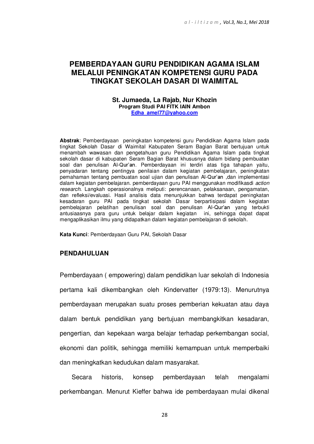 al-Iltizam: Jurnal Pendidikan Agama Islamal-Iltizam: Jurnal Pendidikan Agama IslamPemberdayaan peningkatan kompetensi guru Pendidikan Agama Islam pada tingkat Sekolah Dasar di Waimital Kabupaten Seram Bagian Barat bertujuan untuk menambah wawasan dan pengetahuan guru Pendidikan Agama Islam pada tingkat sekolah dasar di kabupaten Seram Bagian Barat khususnya dalam bidang pembuatan soal dan penulisan Al-Quran. Pemberdayaan ini terdiri atas tiga tahapan yaitu, penyadaran tentang pentingnya penilaian dalam kegiatan pembelajaran, peningkatan pemahaman tentang pembuatan soal ujian dan penulisan Al-Quran, dan implementasi dalam kegiatan pembelajaran. Pemberdayaan guru PAI menggunakan modifikasi action research. Langkah operasionalnya meliputi: perencanaan, pelaksanaan, pengamatan, dan refleksi/evaluasi. Hasil analisis data menunjukkan bahwa terdapat peningkatan kesadaran guru PAI pada pembelajaran pelatihan penulisan soal dan penulisan Al-Quran yang terbukti dengan antusiasnya para guru untuk belajar dalam kegiatan ini, sehingga dapat mengaplikasikan ilmu yang didapatkan dalam kegiatan pembelajaran di sekolah.