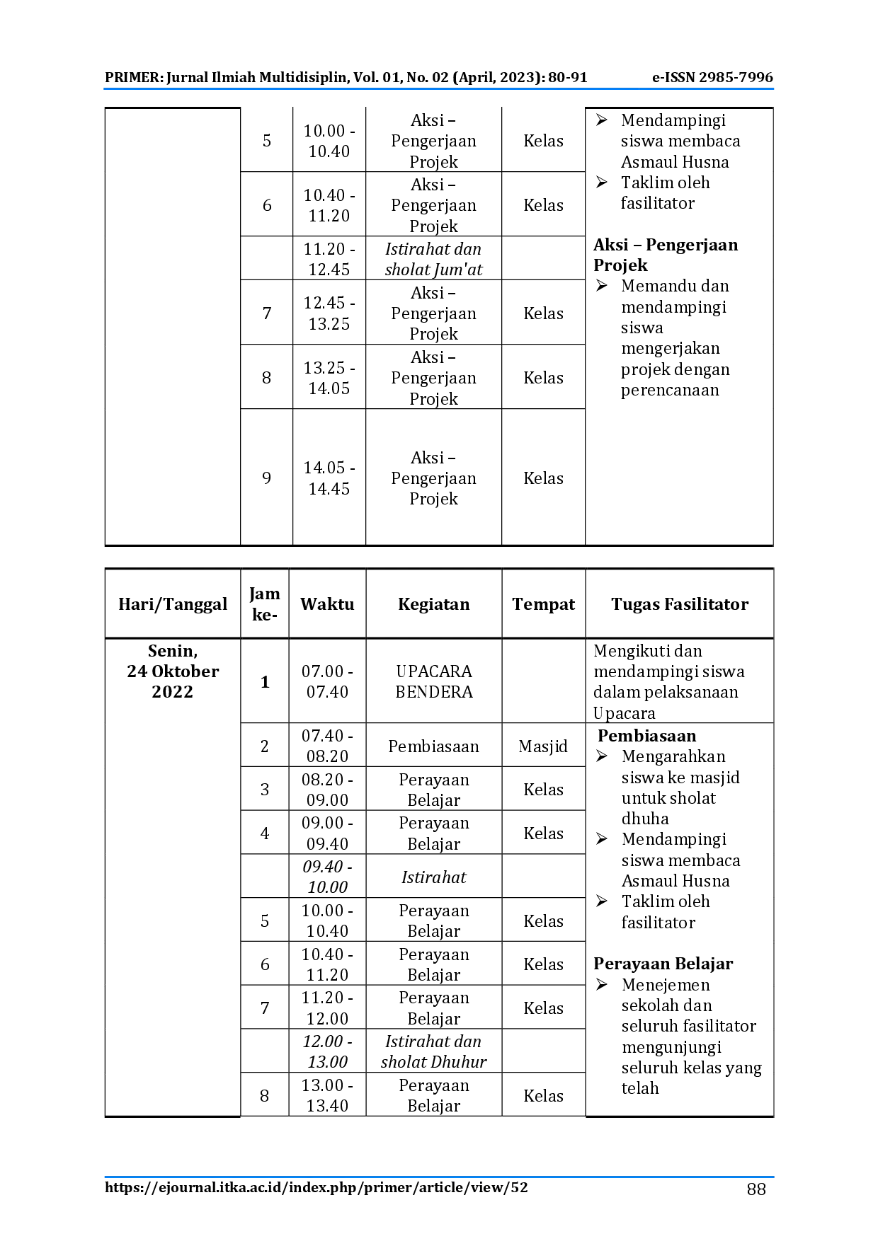 PRIMER : Jurnal Ilmiah MultidisiplinPRIMER : Jurnal Ilmiah MultidisiplinProjek penguatan profil pelajar Pancasila merupakan kegiatan kokurikuler berbasis projek yang dirancang untuk menguatkan upaya pencapaian kompetensi dan karakter sesuai dengan profil pelajar Pancasila. Tujuan dari aksi nyata 5K yang ramah lingkungan di kelasku untuk mewujudkan kelasku surgaku ini meliputi 2 aspek, yaitu aspek karakter dan aspek produk.