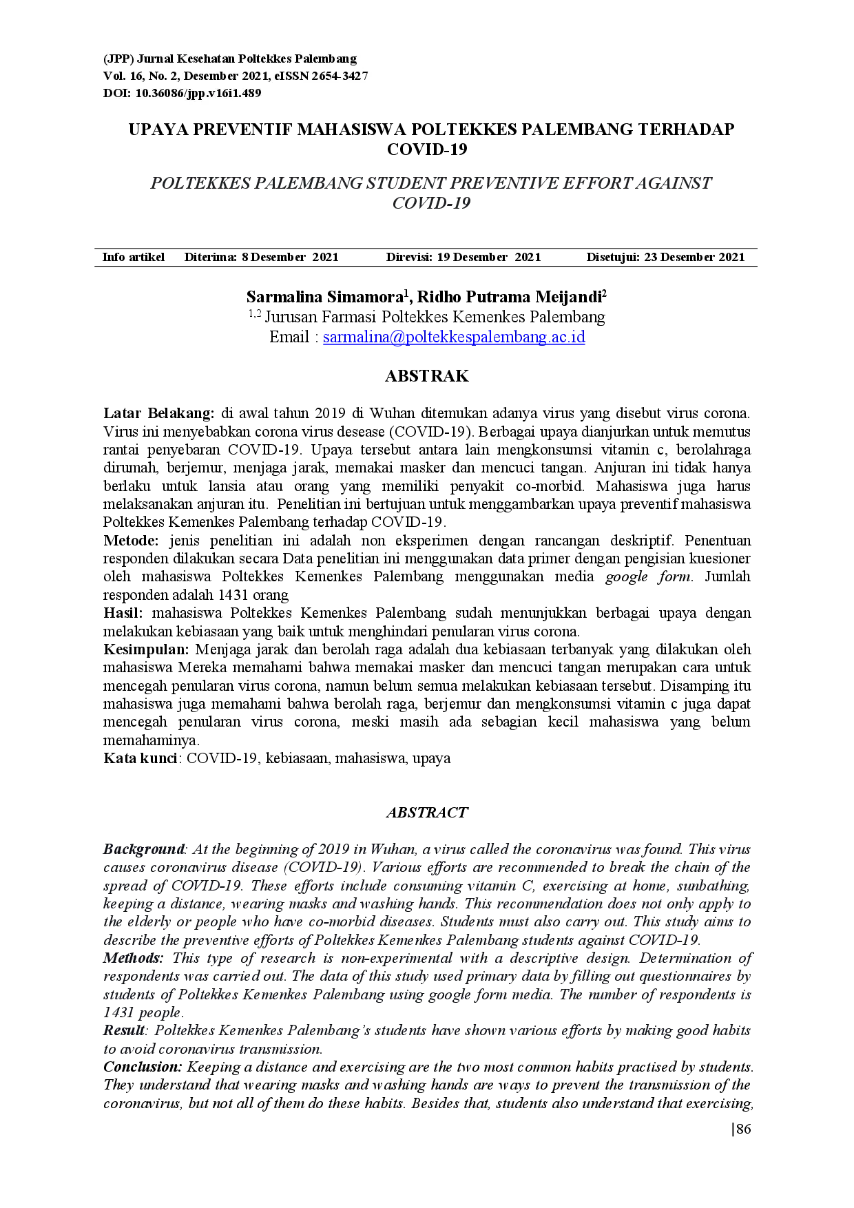 JPP (Jurnal Kesehatan Poltekkes Palembang)JPP (Jurnal Kesehatan Poltekkes Palembang)Latar belakang: Pada awal 2019 di Wuhan ditemukan virus corona yang menyebabkan COVID-19. Berbagai upaya seperti mengonsumsi vitamin C, berolahraga di rumah, berjemur, menjaga jarak, memakai masker dan mencuci tangan dianjurkan untuk memutus rantai penyebaran. Mahasiswa kesehatan sebagai calon tenaga kesehatan dan role model diharapkan menerapkan anjuran tersebut. Penelitian ini bertujuan menggambarkan upaya preventif mahasiswa Poltekkes Kemenkes Palembang terhadap COVID-19. Metode: Penelitian non-eksperimen deskriptif dilakukan Maret–Mei 2021 di 13 program studi dengan kuesioner online Google Form. Jumlah responden 1.431 mahasiswa. Hasil: Mahasiswa telah menunjukkan upaya preventif dengan membiasakan perilaku hidup sehat untuk menghindari penularan virus corona. Kesimpulan: Menjaga jarak dan berolahraga merupakan kebiasaan terbanyak yang dilakukan mahasiswa. Mereka memahami manfaat masker dan cuci tangan namun belum semua mengamalkannya. Mahasiswa juga memahami manfaat olahraga, berjemur dan vitamin C meski sebagian kecil belum memahaminya.
