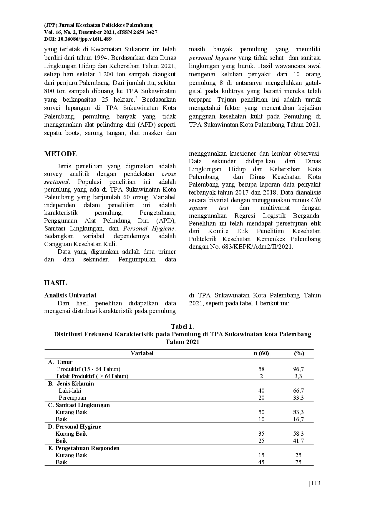 JPP (Jurnal Kesehatan Poltekkes Palembang)JPP (Jurnal Kesehatan Poltekkes Palembang)Penyakit kulit merupakan penyakit menular yang dapat dialami oleh pemulung karena risiko dari lingkungan kerjanya dan dapat dicegah dengan membiasakan perilaku penggunaan alat pelindung diri (APD) yang baik. Sanitasi lingkungan dan personal hygiene yang baik juga dapat mencegah timbulnya penyakit kulit. Penelitian ini menggunakan metode kuantitatif. Jenis penelitian yang digunakan adalah analitik dengan pendekatan cross sectional. Teknik pengumpulan data melalui observasi dan wawancara. Penelitian ini dilaksanakan pada bulan Mei 2021. Populasi studi penelitian ini adalah pemulung di TPA Sukawinatan Kota Palembang. Sampel dengan jumlah 60 pemulung. Analisis data menggunakan chi-squared test dan Regresi Logistik Berganda. 60 pemulung pada penelitian, sebanyak 40 (66,7%) pemulung mengalami keluhan gangguan kesehatan kulit. Hasil penelitian menunjukkan adanya hubungan pengetahuan (p-value = 0,027) penggunaan apd (p-value=0,014) dan personal hygiene dengan gangguan kesehatan kulit (p-value = 0,012). Tidak ada hubungan sanitasi lingkungan dengan gangguan kesehatan kulit (p-value = 0,595). Variabel yang menentukan keluhan gangguan kulit pada pemulung adalah penggunaan APD, dengan Odds Ratio (OR) 6,284 yang artinya pemulung yang menggunakan APD kurang baik akan meningkatkan Risiko sebesar 6,28 kali lebih tinggi untuk mengalami gangguan kulit dibandingkan pemulung yang menggunakan APD dengan baik setelah dikontrol variabel personal higiene.