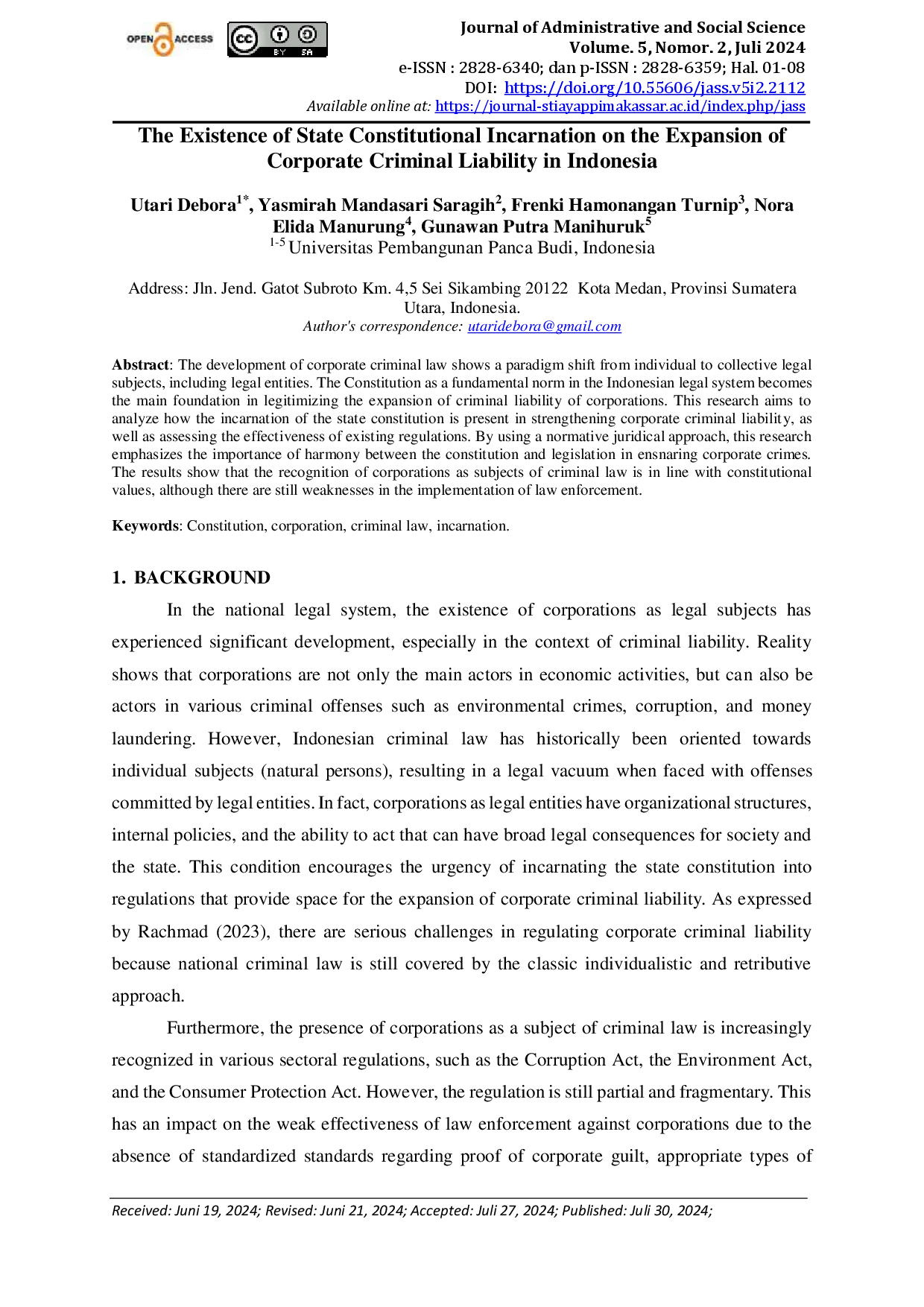 JOURNAL OF ADMINISTRATIVE AND SOCIAL SCIENCEJOURNAL OF ADMINISTRATIVE AND SOCIAL SCIENCEPerkembangan hukum pidana korporasi menunjukkan peralihan paradigma dari subjek hukum individu ke subjek kolektif, termasuk badan hukum. Undang-Undang Dasar sebagai norma fundamental dalam sistem hukum Indonesia menjadi pijakan utama dalam melegitimasi perluasan pertanggungjawaban pidana korporasi. Penelitian ini bertujuan menganalisis bagaimana pencerminan konstitusi negara hadir dalam penguatan pertanggungjawaban pidana korporasi serta menilai efektivitas regulasi yang ada. Dengai pendekatan yuridis normatif, penelitian menekankan pentingnya harmoni antara konstitusi dan peraturan perundang-undangan dalam menjerat kejahatan korporasi. Hasil menunjukkan bahwa pengakuan korporasi sebagai subjek hukum pidana sejalan dengan nilai konstitusi, meskipun masih terdapat kelemahan dalam implementasi penegakan hukum.