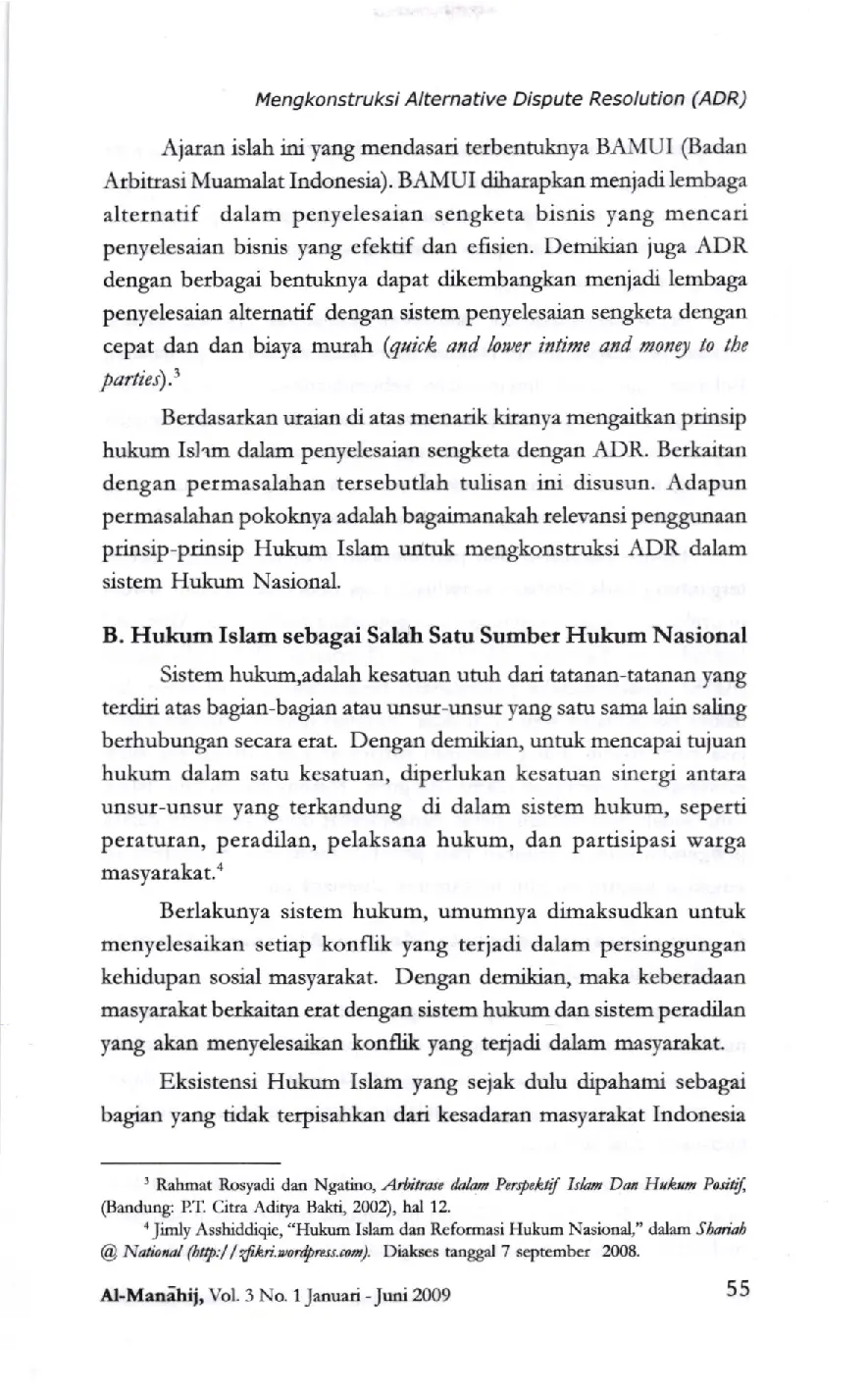 Al-Manahij: Jurnal Kajian Hukum IslamAl-Manahij: Jurnal Kajian Hukum IslamAlternatif penyelesaian sengketa atau ADR merupakan metode untuk menyelesaikan konflik secara damai dan sepakat yang telah menjadi tradisi panjang di Indonesia. Prinsip-prinsip musyawarah dan negosiasi yang ada dalam hukum adat serta prinsip-prinsip dalam hukum Islam, sebagai bagian dari hukum nasional, memungkinkan pengawasan terhadap perdamaian dan kesepakatan yang ada dalam ajaran islah untuk membangun ADR dalam sistem hukum nasional.