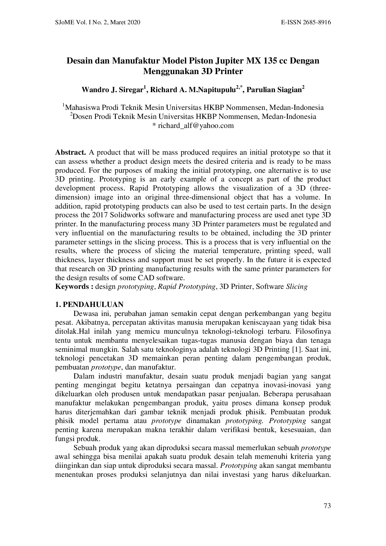 SPROCKET JOURNAL OF MECHANICAL ENGINEERINGSPROCKET JOURNAL OF MECHANICAL ENGINEERINGSebuah produk yang akan diproduksi secara massal memerlukan prototipe awal agar dapat menilai apakah desain produk memenuhi kriteria yang diinginkan dan siap untuk produksi massal. Untuk keperluan pembuatan prototipe awal tersebut, salah satu alternatif adalah menggunakan pencetakan 3D. Prototipe adalah contoh awal dari konsep sebagai bagian dari proses pengembangan produk. Prototipe cepat memungkinkan visualisasi gambar 3D menjadi objek tiga dimensi asli yang memiliki volume. Selain itu, produk prototipe cepat juga dapat digunakan untuk menguji bagian tertentu. Dalam proses desain, digunakan perangkat lunak Solidworks 2017 dan proses manufaktur dengan printer 3D jenis Anet. Pada proses manufaktur, banyak parameter printer 3D harus diatur karena sangat memengaruhi hasil manufaktur yang diperoleh, termasuk pengaturan parameter printer 3D dalam proses slicing. Ini adalah proses yang sangat memengaruhi hasilnya, di mana suhu material, kecepatan pencetakan, ketebalan dinding, ketebalan lapisan, dan dukungan harus diatur secara tepat. Pada masa mendatang, diharapkan adanya penelitian tentang hasil manufaktur pencetakan 3D dengan parameter printer yang sama untuk hasil desain dari berbagai perangkat lunak CAD.