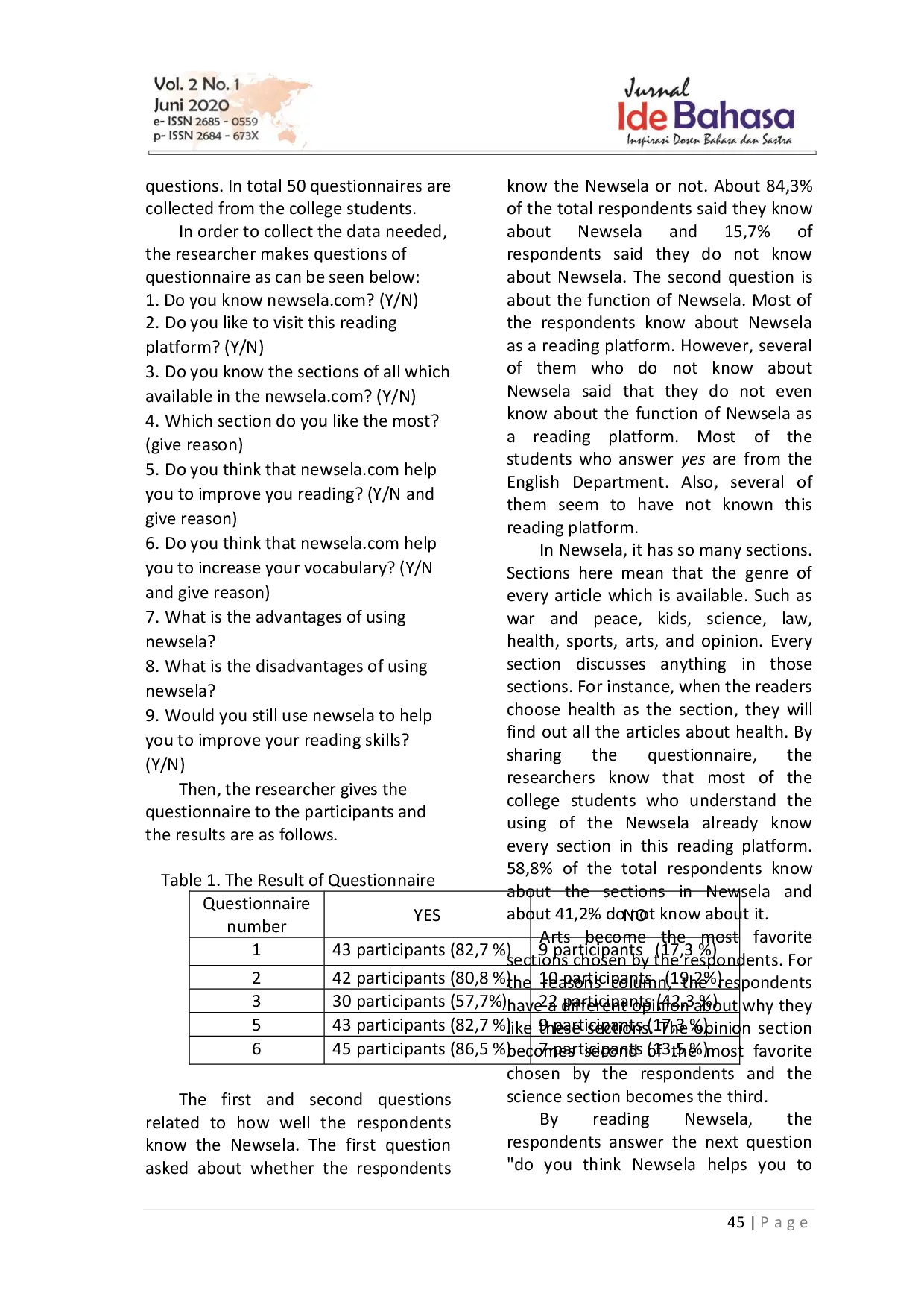 IdeBahasaIdeBahasaSiswa digital native lahir di era jaringan instan yang membuat segala sesuatu memiliki koneksi dengan teknologi. Hal ini memungkinkan potensi keterampilan dan pengetahuan teknologi mahasiswa untuk ditingkatkan guna tercapainya keterlibatan pembelajaran yang lebih baik di dalam kelas. Sebagai tindak lanjut dari penerbitan Permendikbud Nomor 23 Tahun 2015 mengenai Gerakan Penumbuhan Budi Pekerti, pada tahun 2017 pemerintah mulai meningkatkan secara intens budaya literasi di sekolah melalui Gerakan Literasi Sekolah (GLS). Guru perlu dapat memberikan teladan dalam menciptakan semangat budaya literasi di sekolah. Melalui peningkatan budaya membaca siswa ini juga meningkatkan kosakata siswa dalam pembelajaran bahasa Inggris. Aplikasi Newsela dapat membantu guru dan siswa untuk menambah referensi guna memperkaya ilmu sebagai bekal pembelajaran. Penelitian ini bertujuan untuk membedakan penggunaan Newsela sebagai media literasi untuk memperkaya kosakata siswa. Penelitian ini mencoba menjawab dua pertanyaan penelitian: (1) apakah Newsela membantu siswa meningkatkan kemampuan membaca mereka? Dan (2) bagaimana dampak aplikasi Newsela terhadap pengembangan kosakata siswa? Langkah-langkah yang digunakan peneliti adalah: pertama, para peneliti membagikan kuesioner kepada mahasiswa bahasa Inggris. Kedua, para peneliti mengevaluasi tanggapan dari responden. Ketiga, para peneliti menemukan jawaban tentang dampak Newsela terhadap siswa. Penelitian ini menggunakan deskriptif kualitatif untuk melaksanakan penelitian ini. Hasil penelitian ini menunjukkan bahwa Newsela membantu siswa meningkatkan kemampuan membaca.