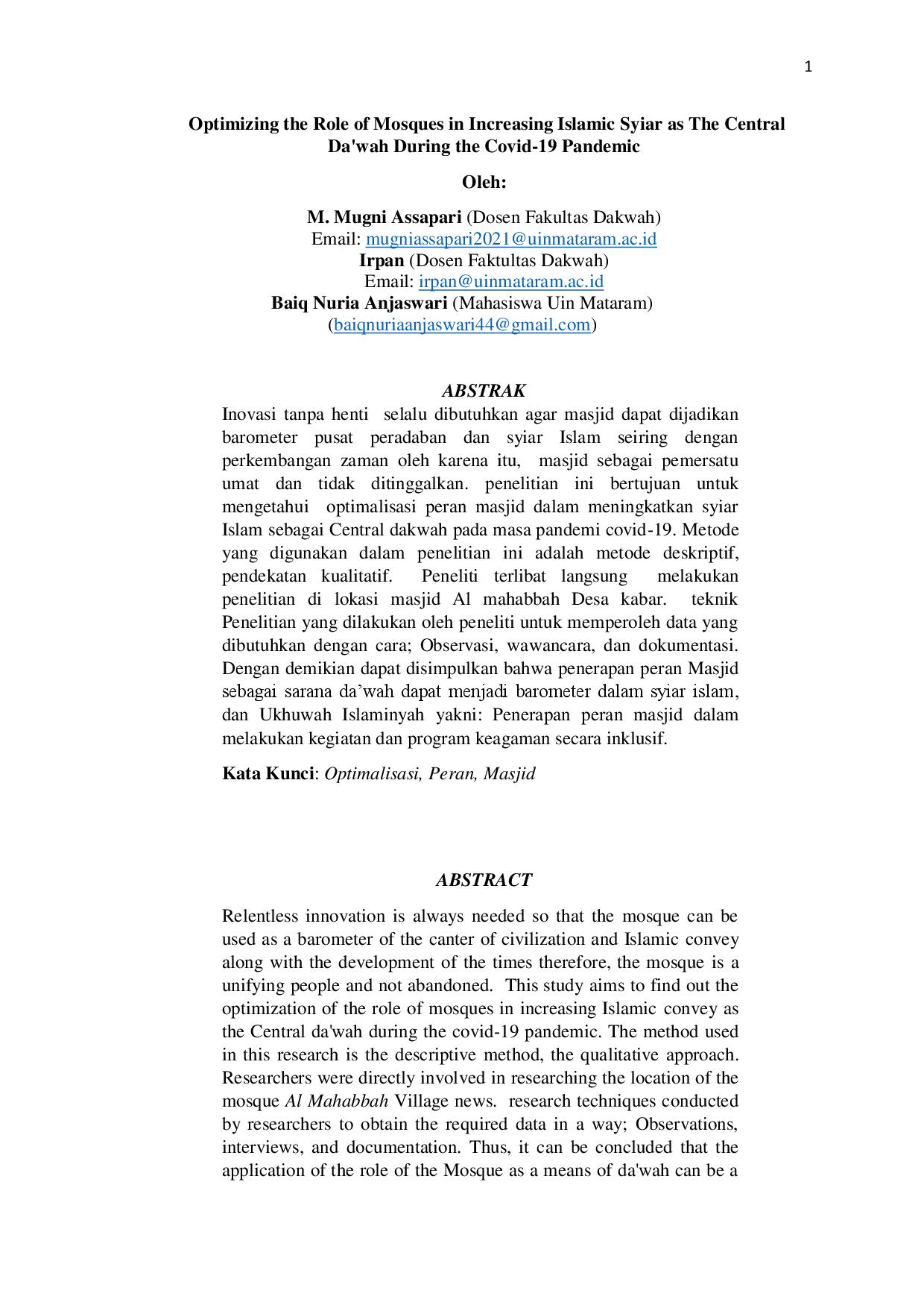 Masjid sebagai pusat dakwah dan pendidikan Islam dapat meningkatkan syiar agama selama pandemi Covid-19.Dengan mengamankan protokol kesehatan, menyederhanakan aktivitas, dan meningkatkan komunikasi antara pengurus dan jamaah, masjid dapat tetap menjadi pusat pendidikan dan dawah penting.Selanjutnya, peningkatan manajemen sumber daya manusia, terutama generasi muda, sangat diperlukan untuk memastikan kelanjutannya.